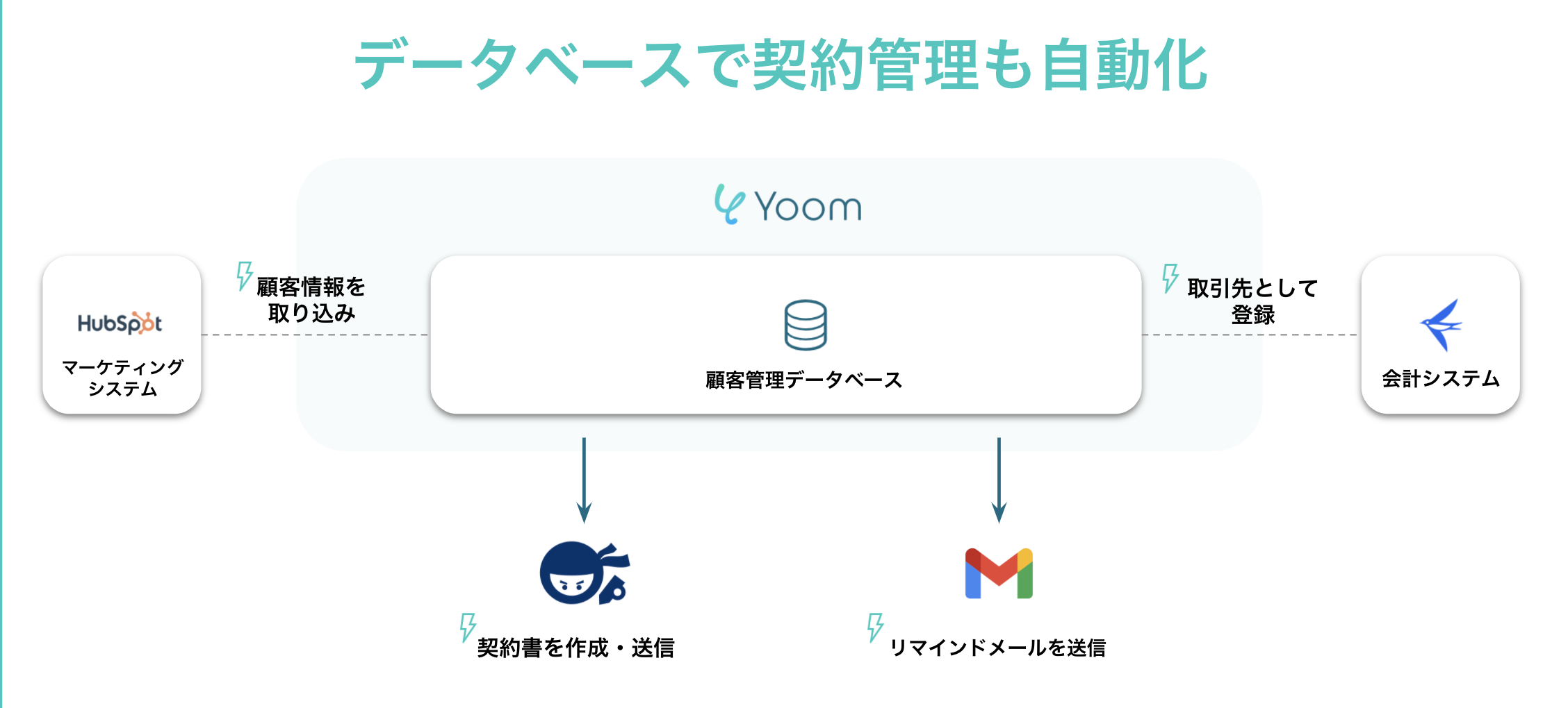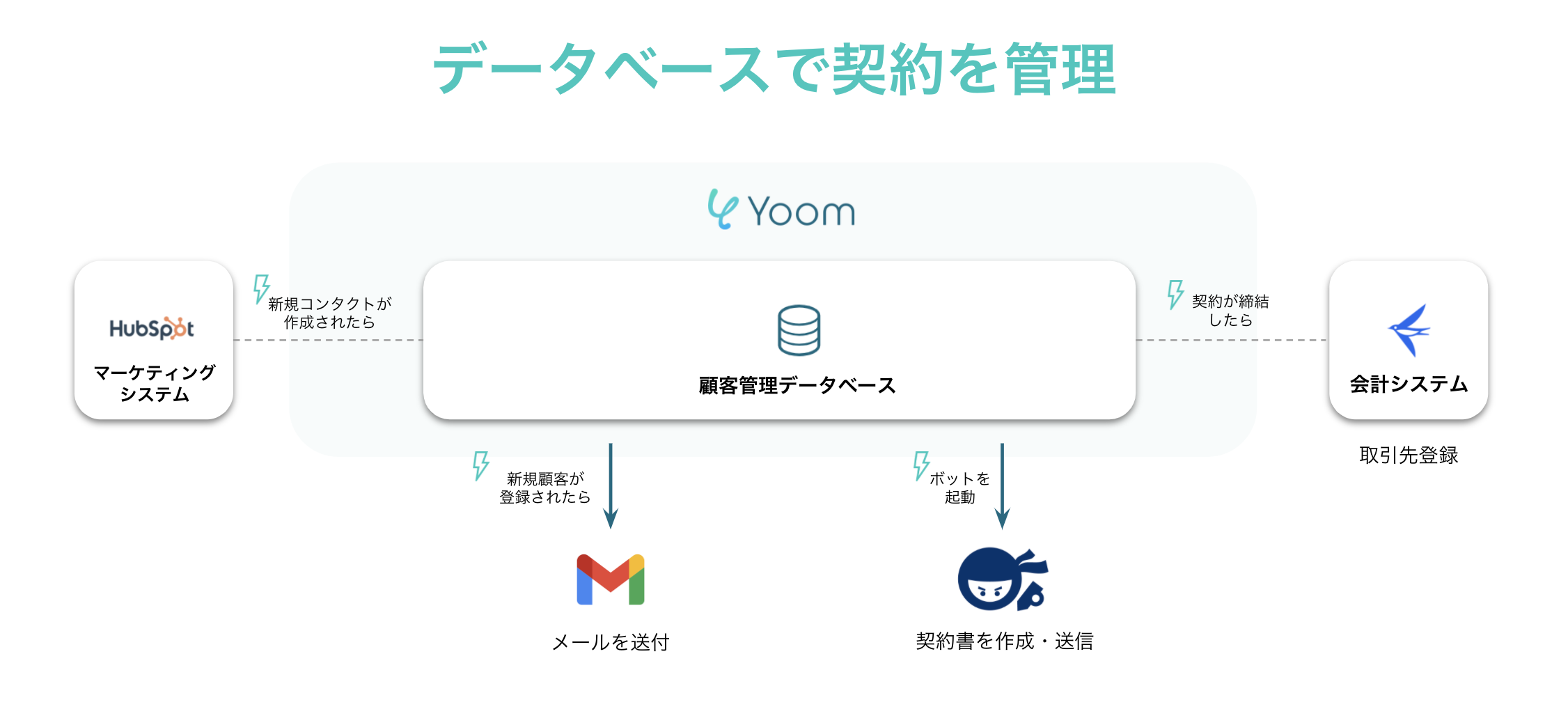 『Yoom』のデータベース機能を使用することで、下記のような契約管理に関わる一連の業務も自動化が可能です。