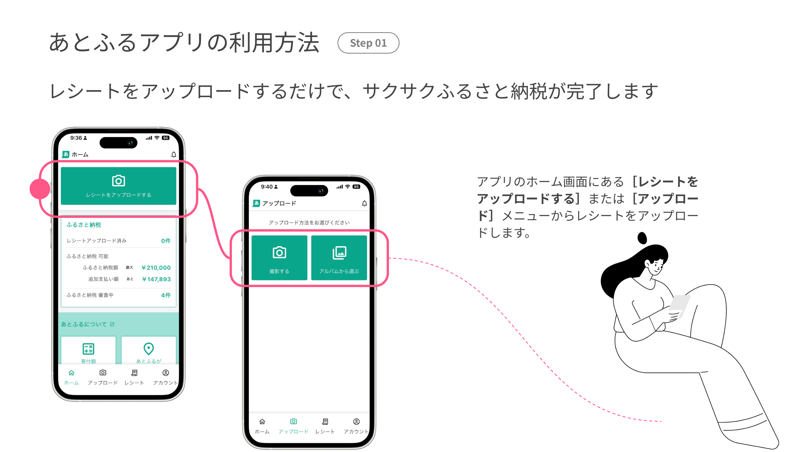 カメラで撮影、またはアルバムから選択するだけで、ふるさと納税がスタートします。