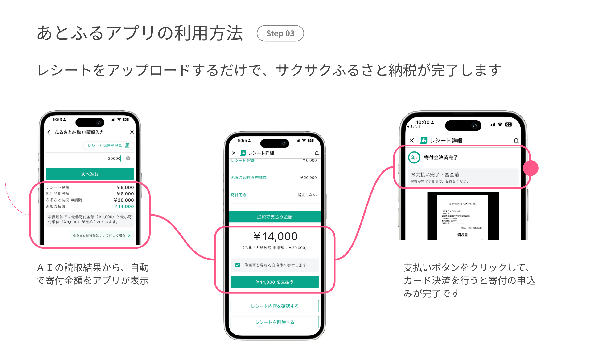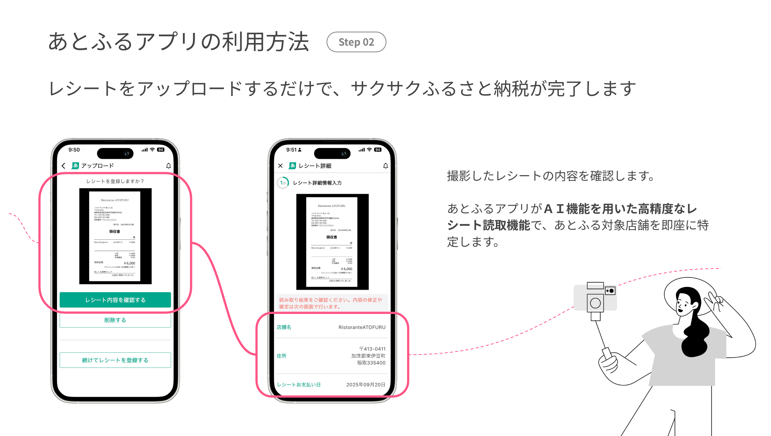 対象施設・店舗のレシートを「あとふるアプリ」に登録すると、金額にもとづき追加寄付額が自動算出され、アプリ上でそのまま決済が可能です。これにより、ふるさと納税が成立します。