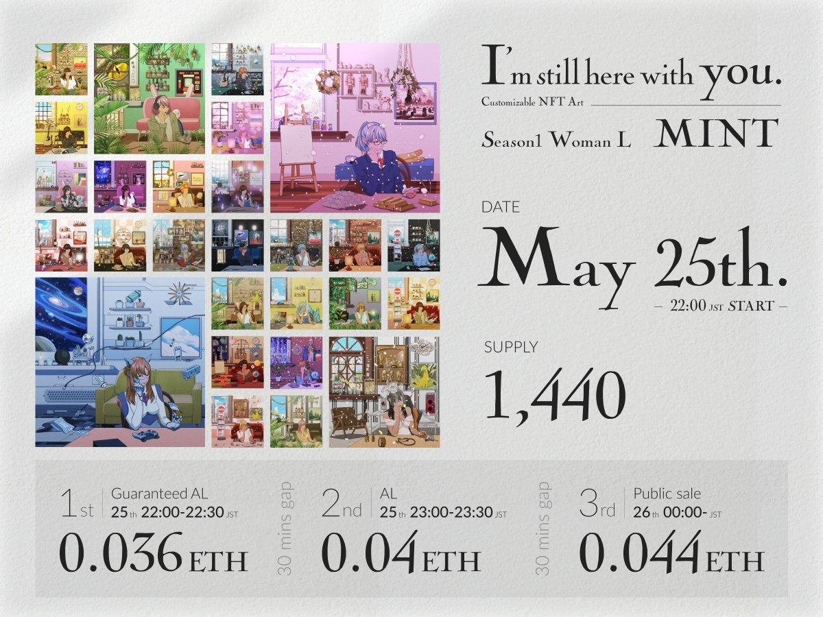 WithYou NFTは部屋の中の風景がコンセプトのNFTですが、まずは女性が左側にいる部屋を映した「Season1 Woman L」を掲題の2023年5月末にリリースします。