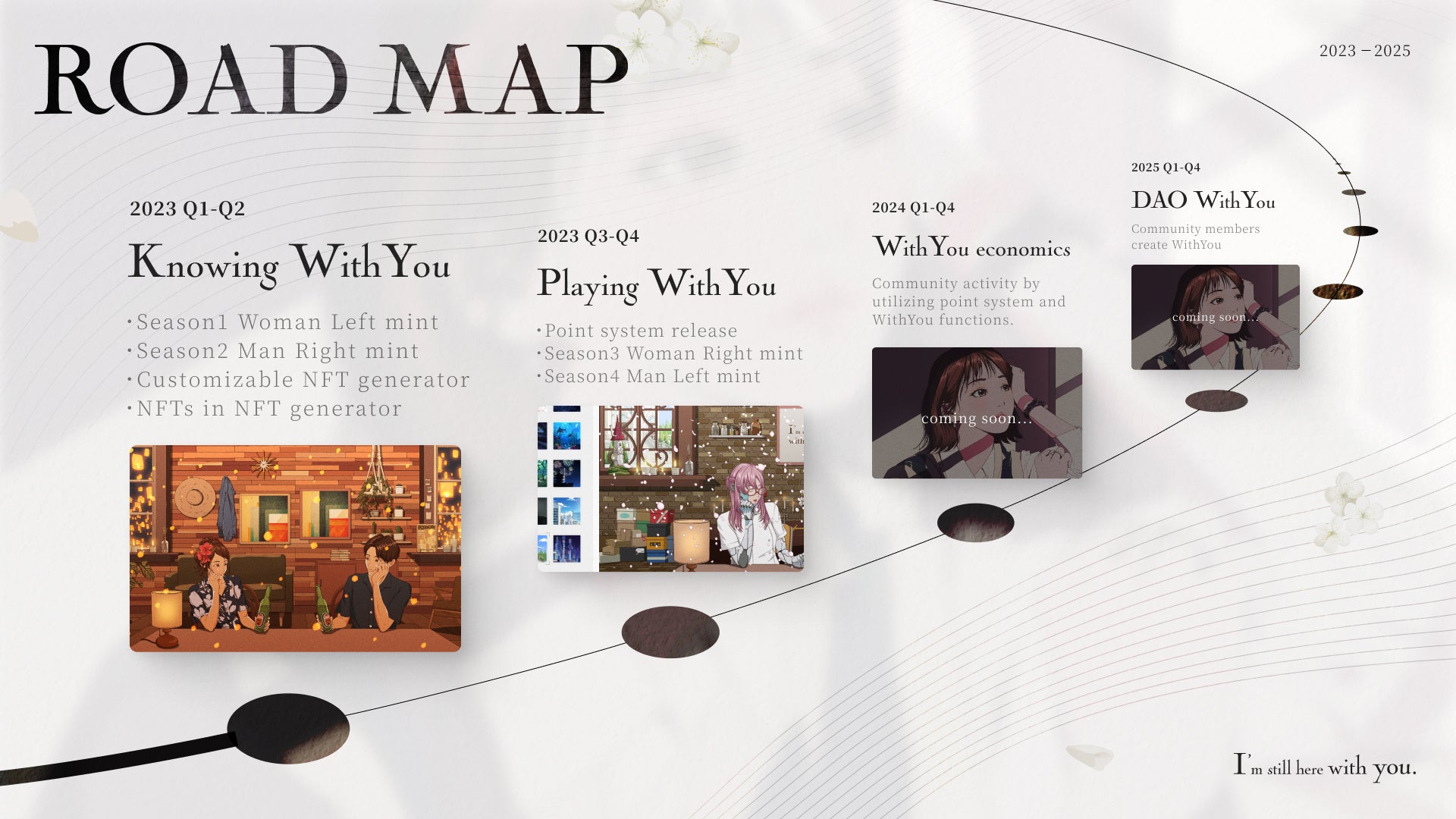 WithYou NFTは、Web3業界の「Digital NFT Art Gallery」となることを目指しており、リリース後もより一層、「Hold to Earn」の仕組みや、NFTをはじめとしたWeb3プロジェクトのみならず、Web2企業にとってもあたらしいNFTの活用法として機能するような取り組みを推進していきます。