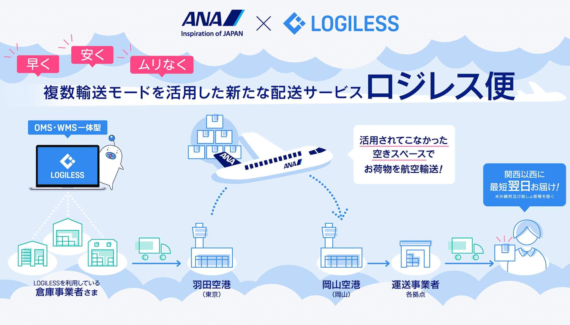 株式会社ロジレス(本社:東京都品川区、代表取締役CEO:足立直之、以下ロジレス)は、全日本空輸株式会社とEC(電子商取引)における効率的な幹線輸送・配送業務を行うことを目的とし、複数の輸送モード(トラック、航空)を活用した新たな配送サービス:『ロジレス便』の試験運転を本日2024年4月1日より開始します。本件は2024年2月27日に発表済みの内容に沿ったものであり、正式サービスリリースは2024年秋ごろを予定しております。