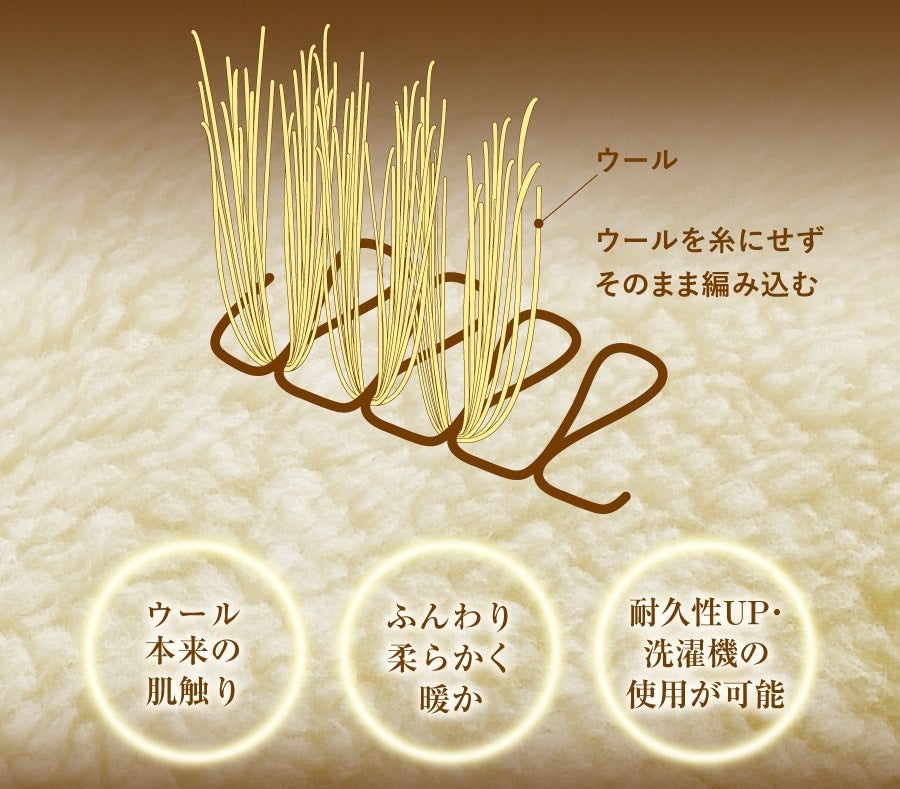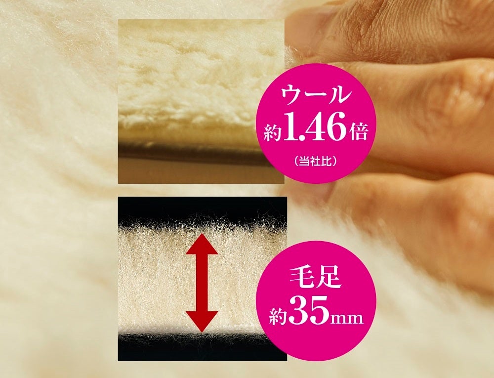 「MAXIMUM The Sofwool®️(以下マキシマム・ザ・ソフゥール)」の毛足は約35mm、指先が埋もれるほどのふっくら感で体を暖かく包み込みます。同シリーズの「The PREMIUM Sofwool®️(ザ・プレミアム・ソフゥール®️)」と比較して毛密度が146%にアップ、さらに高密度になることで暖かさが増しました。ウールを贅沢に使用しています。