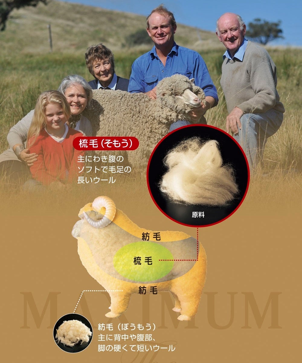 マキシマム・ザ・ソフゥールは上質なオーストラリア産のラムズウールを厳選して使用しています。ラムズウールは生後6か月~10か月の仔羊のファーストカットで採れたウールのことで、採取量はウール全体の約0.32%以下と大変希少なウールです。また一般的なウール毛布は日焼けして硬くなった背中や汚れの目立つ下肢部分の紡毛(ぼうもう)を使うことが多いのですが、マキシマム・ザ・ソフゥールは抜群に柔らかい脇腹部分の梳毛(そもう)のみを使用しています。ウールマークの基準もクリアしており安心です。