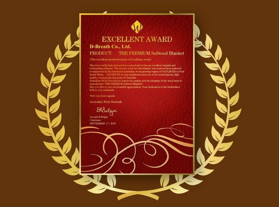 ザ・プレミアム・ソフゥールはウールの本場オーストラリアで「EXCELLENT AWARD(エクセレント・アワード)」を6年連続受賞しています。オーストラリアンウールネットワークでその品質の高さを表彰されました。その品質の高さから一般的なウール毛布との違いを実感できるはずです。