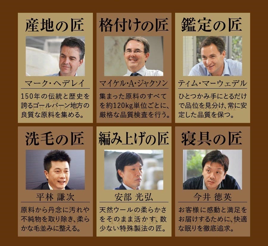 ザ・プレミアム・ソフゥールはウールの生産者から企画者、製造・仕上げまでの全工程に携わる人の「顔が見えるものづくり」を徹底しています。産地、格付け、鑑定、繊毛、編上げ、そして寝具の匠がそれぞれの知恵と技術を結集して作り上げた安心の品質です。