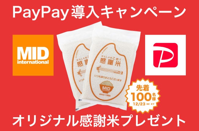 - PayPay導入記念!先着100名様にミッドオリジナル「感謝米」プレゼントキャンペーン開催中