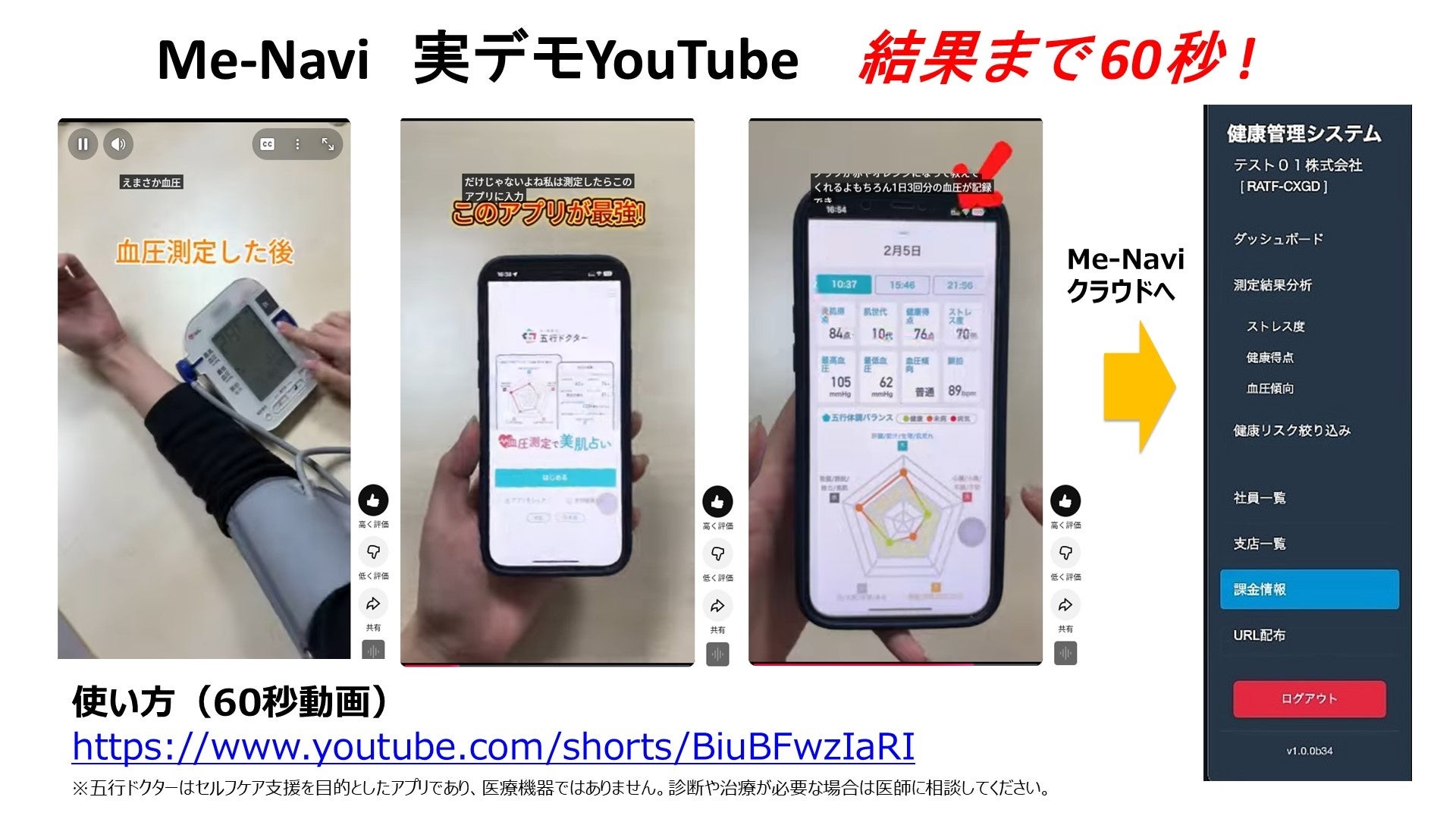 主な機能:健康スコア可視化、血圧傾向分析、ストレス傾向分析、美肌傾向分析、未病/高血圧アラート通知、食事/運動アドバイス、健康・未病ランキング、陰陽五行を使った占い、健康管理レポート生成他