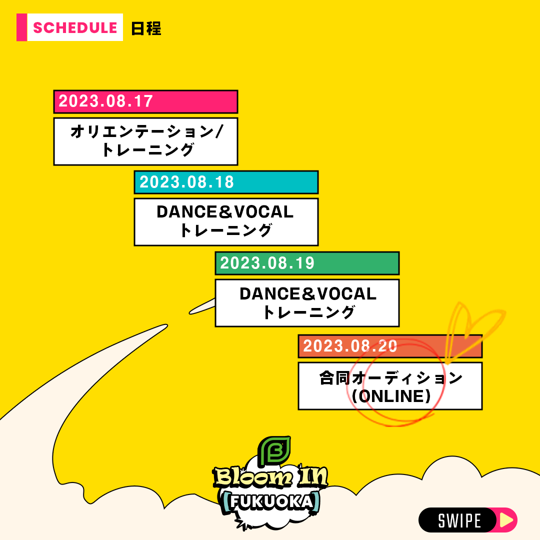 「Bloom In 」は、K-POPアーティストになる夢を叶える貴重な機会となります。参加者は、韓国の一流講師陣から直接指導を受けながら、自身のスキル向上とアーティストとしての成長を目指すことができ、オーディションを通じて韓国に行く切符を掴む大きなチャンスがあります。是非、この機会をお見逃しなく。