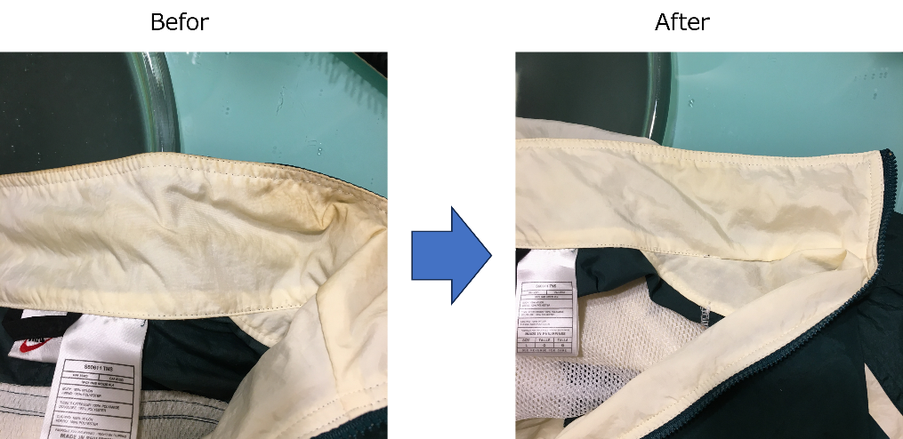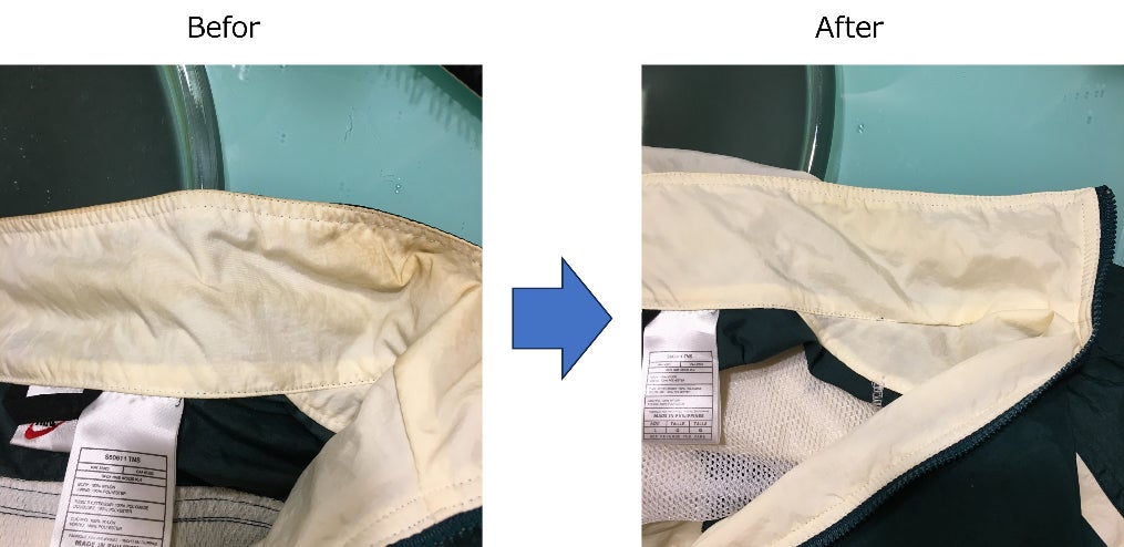 洗濯や漂白などをしても落ちなくなってしまった長年愛用していたスポーツウェアの襟周りの頑固汚れ。中々落ちない汚れのため、過炭酸ナトリウムSTRONGを40℃のお湯に30分漬け置き洗いを実施。黄ばみが綺麗に落ち、汚れがあまり感じられなかった部分もより綺麗になり白さが際立つようになった。