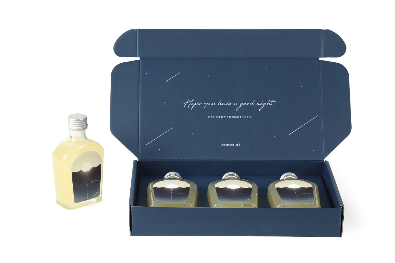 「素敵な月夜を繰り返しお届けしたい」という想いからRemoonと名付けました。ラベルデザインは、CBDによるリラックス効果でぐっすり眠り、翌朝スッキリ目覚める時間をイメージしています。