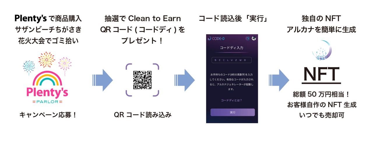 花火大会当日、海辺は密集し、臨時ゴミ箱設置等の対策もありますが、夜で足元も暗く、翌日明るくなると、毎年多くのゴミが散乱しており、地元住民のボランティアなど多くのビーチクリーン活動が実施されています。そこで、ゴミを少しでも減らすため、Web3.0 技術「アニカナ」を活用した地域課題解決のためのプロモーション活動を実施します。同時に、大会当日の店舗の来店促進キャンペーンとして「Plenty’s」にご協力頂き、本キャンペーンが実現いたしました。