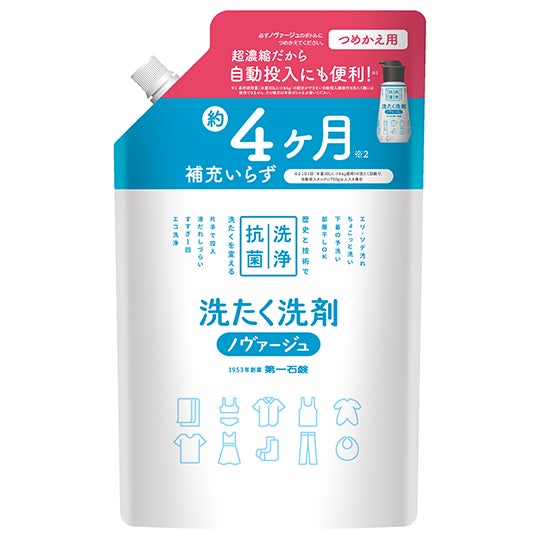 第一石鹸株式会社は、超濃縮衣料用液体洗剤「ノヴァージュ」シリーズに、新たに大容量詰め替えサイズをWEB販売限定にて新発売いたします。