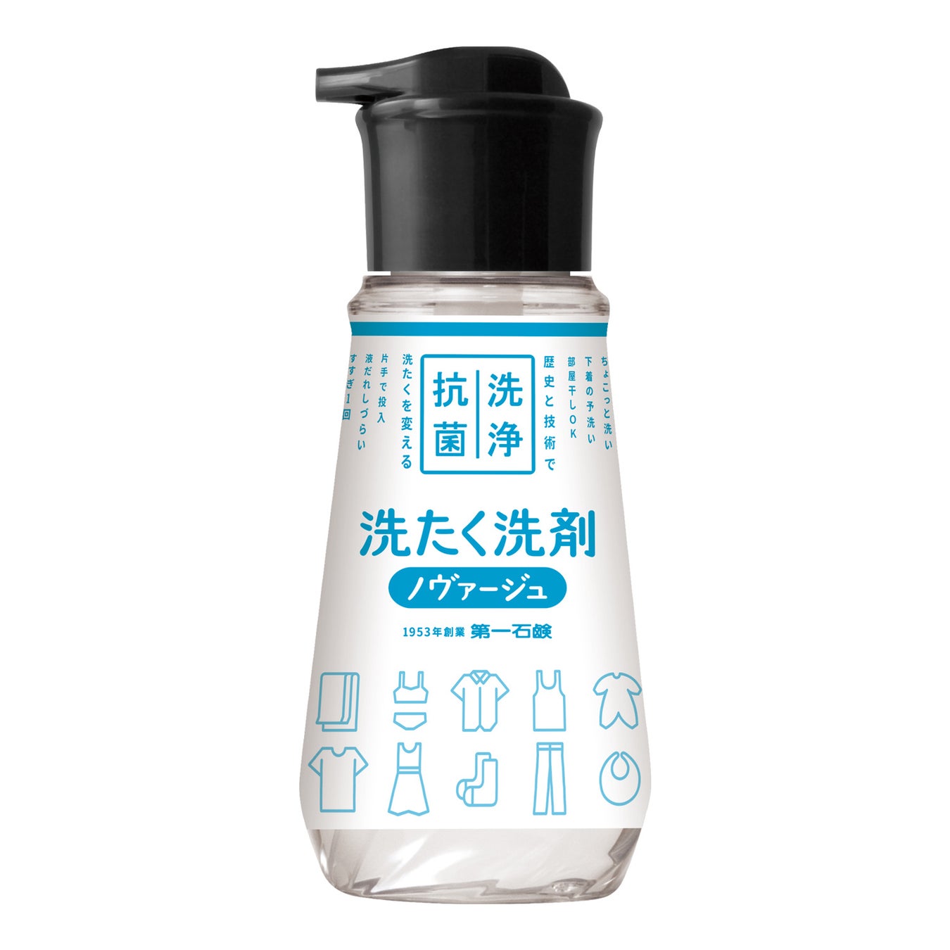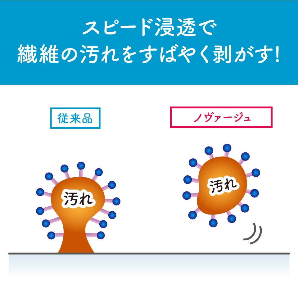 ノヴァージュは通常の60%の使用量(※1)でしっかりと汚れを落とすことができる超濃縮衣料用液体洗剤です。第一石鹸が独自に開発した浸透スピードの速い洗浄成分が従来品よりもスピーディかつしっかりと汚れを引き剥がし、パワフルな洗浄力で衣類の汚れをさっぱりと落とします。蛍光剤・漂白剤・着色料不使用で生成りや淡い色の衣類にも使用可能。香りは衣類に残りにくいさわやかなグリーンの香りです。泡切れがよくすすぎ1回での使用が可能なため、節水や節電を実現。家事の時間短縮とエコにも貢献します。