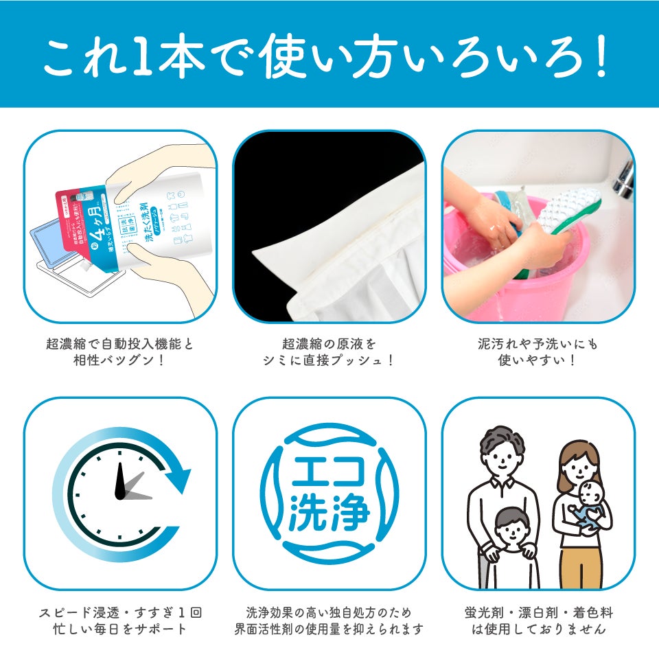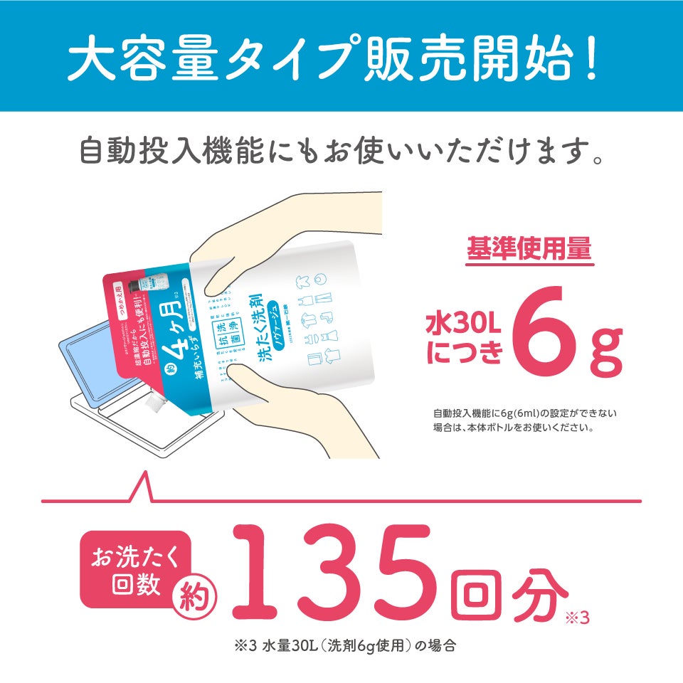 水30Lで1日1回お洗たくした場合、135回のお洗たくが可能。自動投入用の洗剤タンクに全量入れることで約4ヶ月以上補充の必要がありません。※750ml以上の洗剤タンクかつ水30Lに対して6g(6ml)の洗剤使用量を設定した場合で換算