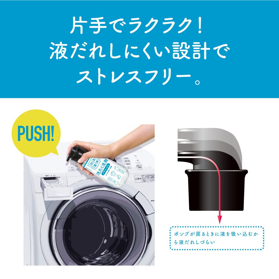 2016年の発売当初よりその超濃縮処方を活かしてコンパクトなプッシュ式ボトルをいち早く採用し、片手・ワンプッシュでの洗たく機への投入を可能にしました。無色透明でサラッとした液体は液づまりしにくく、ポンプ部分はバックサクション機能付きで液だれ防止にも配慮しています。