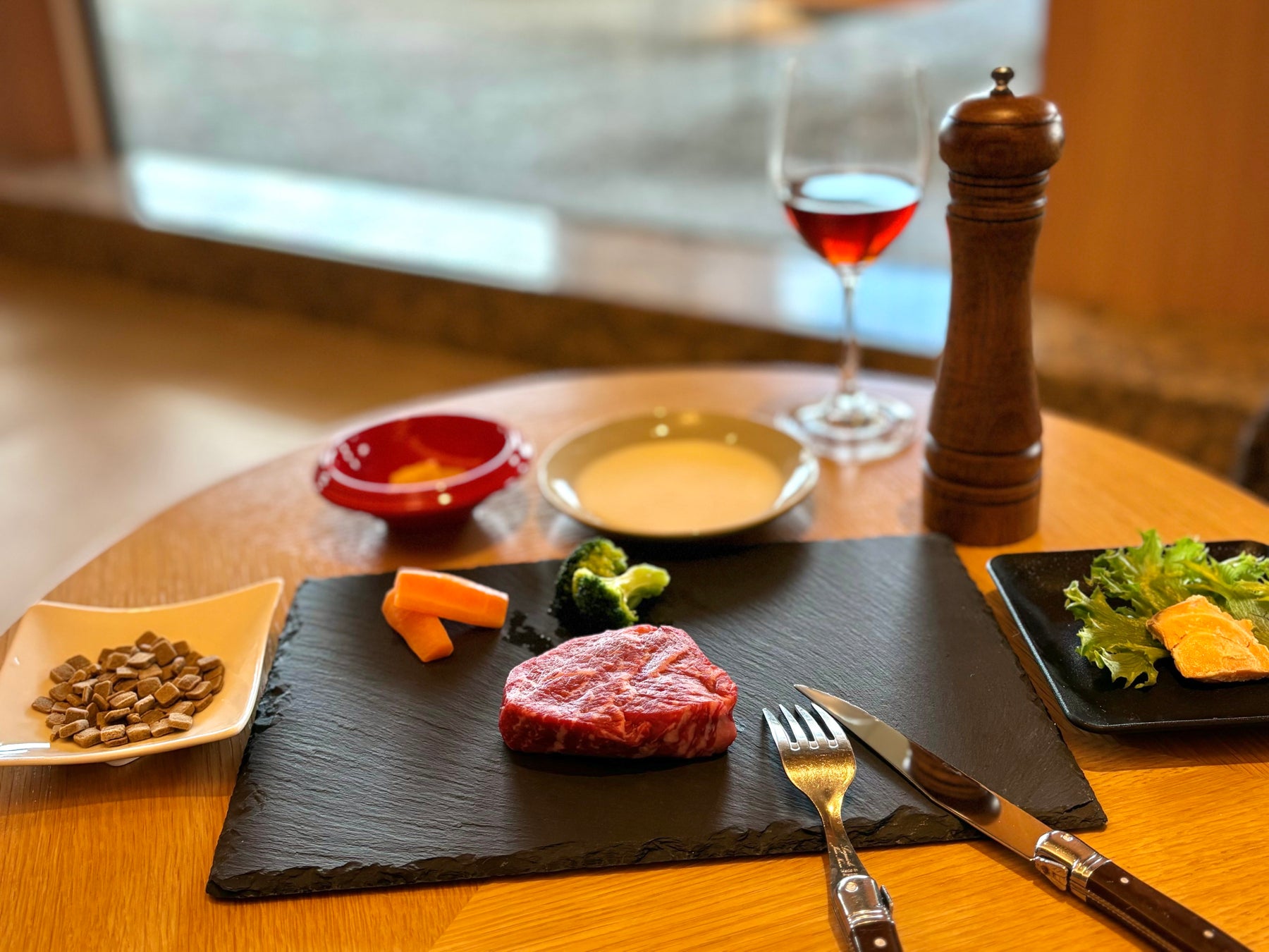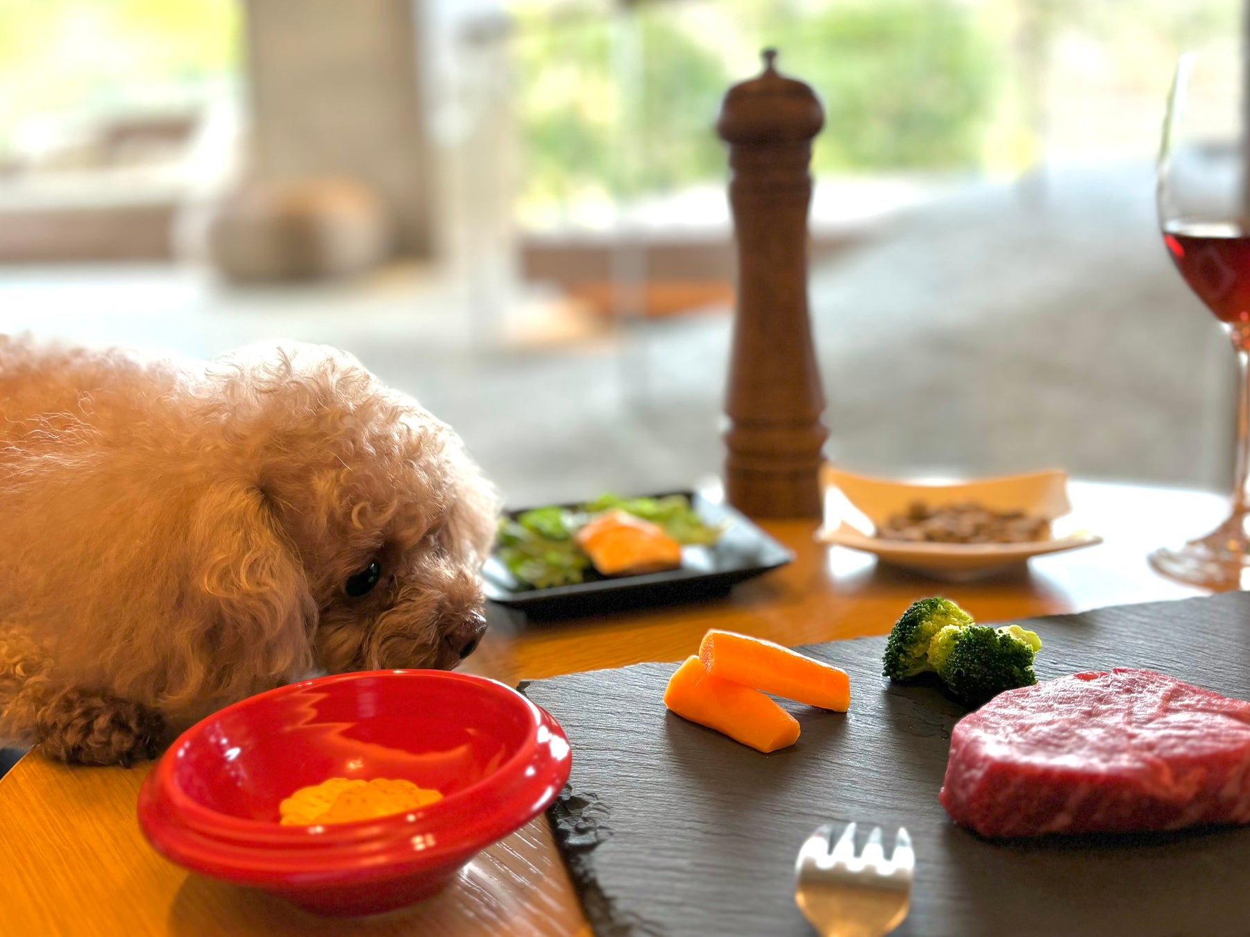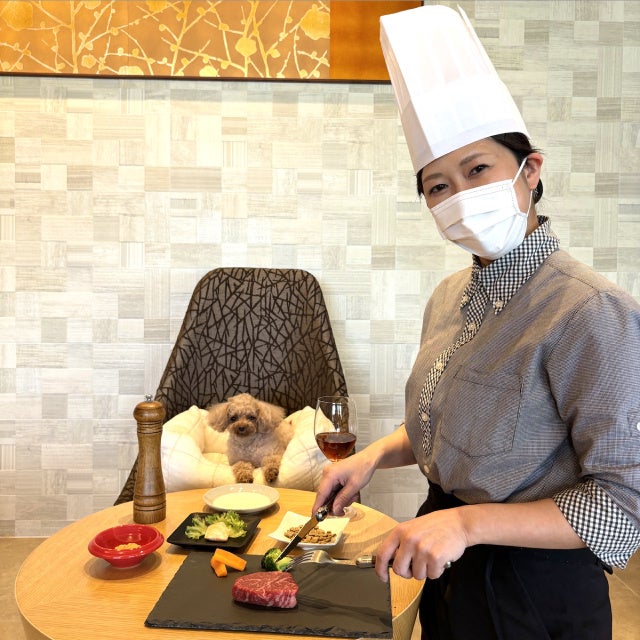 愛犬の目の前でのステーキカットや、りんごチップの入ったペッパーミル、そして赤ワインに模したルイボスティーなどにより特別なディナーを演出いたします。