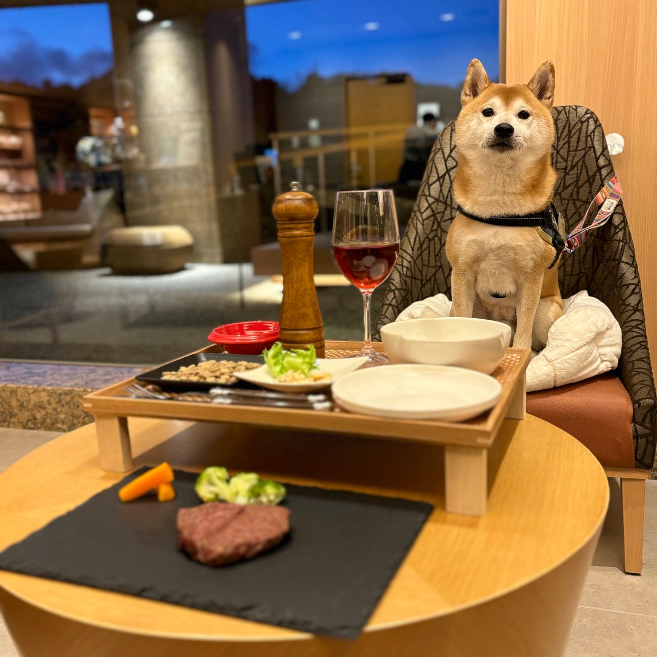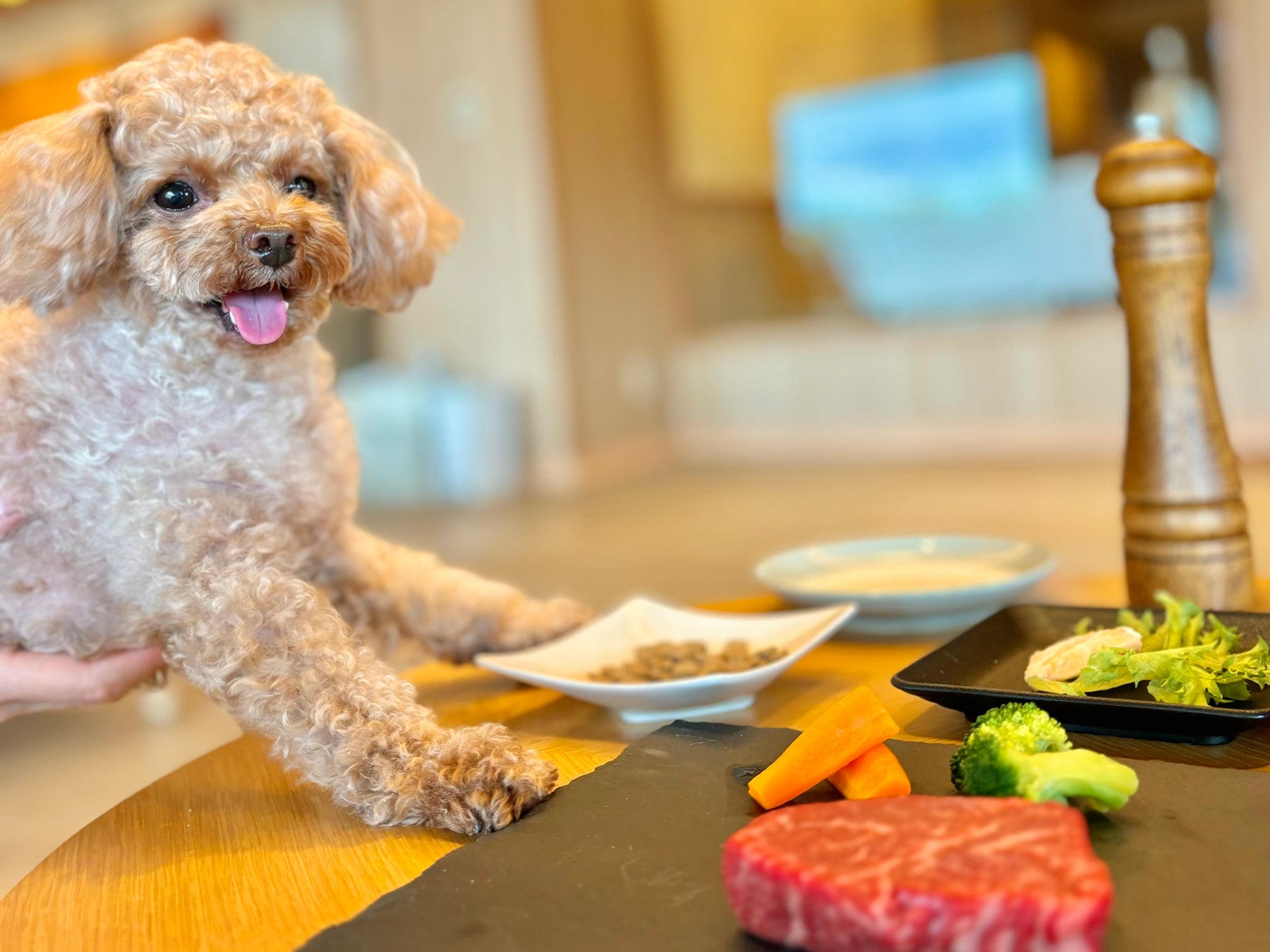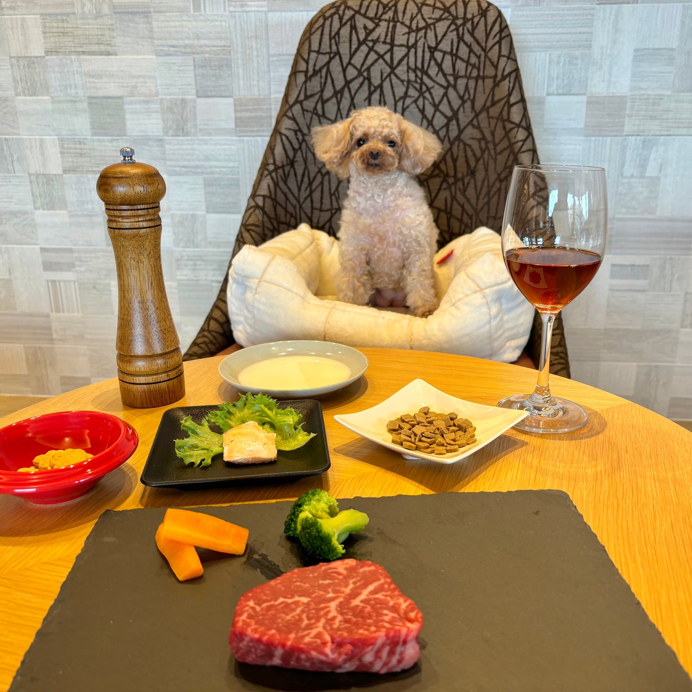 愛犬の目の前でのステーキカットや、りんごチップの入ったペッパーミル、そして赤ワインに模したルイボスティーなどにより特別なディナーを演出いたします。