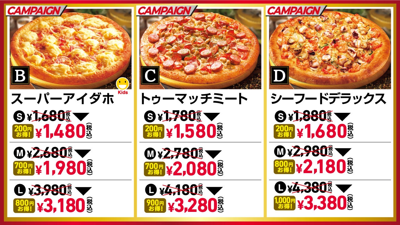 また、ナオツイスターサンド以外に「スーパーアイダホ」「トゥーマッチミート」「シーフードデラックス」の人気ピザ3種もお得なキャンペーン割引価格最大1000円割引で登場。