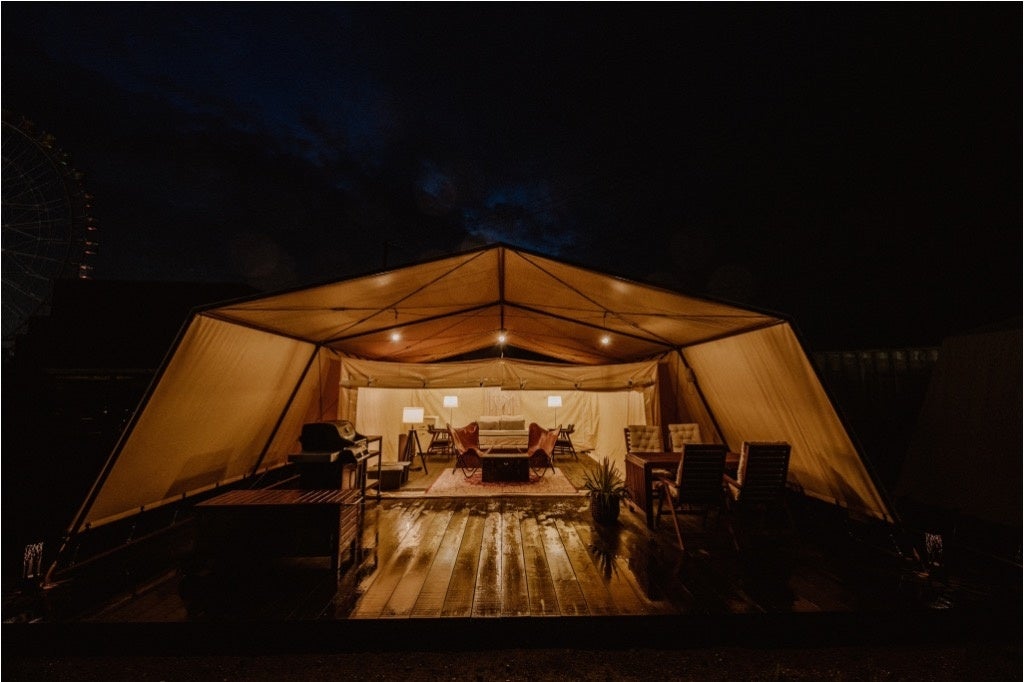 外部テントも内装もラグジュアリーな演出と充実した設えと設備になっておりワンランク上の上質なキャンプが楽しめます。