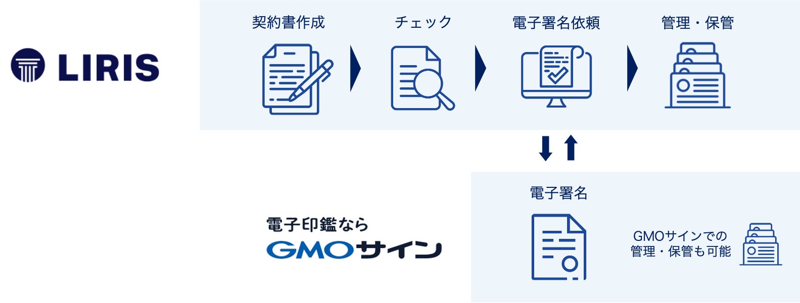 LIRIS株式会社(東京都中央区、代表取締役:鈴木秀幸、読み:ライリス、以下「LIRIS」)とGMOインターネットグループのGMOグローバルサイン・ホールディングス株式会社(代表取締役社長:青山 満、以下「GMOグローバルサイン・HD」)は、本日2022年7月11日(月)より、LIRISが提供するAI契約管理アプリケーション『LIRIS契約ライフサイクルマネジメント』(LIRIS CLM、以下「LIRIS CLM」)と、GMOグローバルサイン・HDが提供するクラウド型電子契約サービス「電子印鑑GMOサイン」の連携を開始いたします。