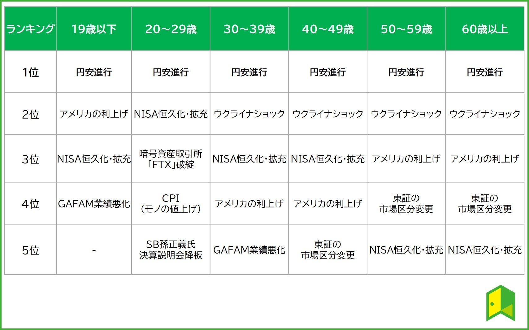 また、円安進行と同じく、「NISA恒久化・拡充」が全年代のトップ5にランクイン。