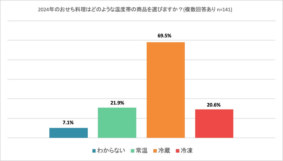 おせち料理を全部買うと回答した141人に、「どのような温度帯のものを選びますか」と質問したところ 一般的に人気の「冷凍」を 「冷蔵」を選ぶと回答した人が上回る結果に。「常温」と答えた人が2位で21.9%。一般的な冷凍おせちに比べ、冷蔵おせちへの期待が高いことが伺えます。