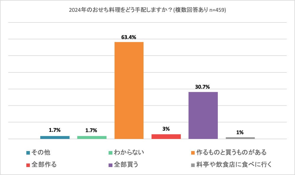 おせち料理を食べる予定があると答えた人に「おせち料理をどう手配しますか」と質問したところ、「作るものと買うものがある」という回答は63.4%、「全部買う」は30.7%という結果になりました。「全部作る」という回答は3%に留まり、ライフスタイルの変化から、伝統的に全部作るおせちから、それぞれの生活様式に合わせて、選択するという多様な傾向がみられる。