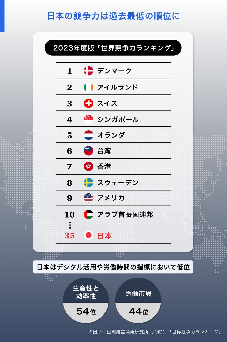 スイスの国際経営開発研究所(IMD)が2023年6月に発表した2023年版「世界競争力ランキング」では、日本は64ヵ国中35位と過去最低の順位となり、アジア太平洋地域でも14ヵ国中11位という結果となりました。