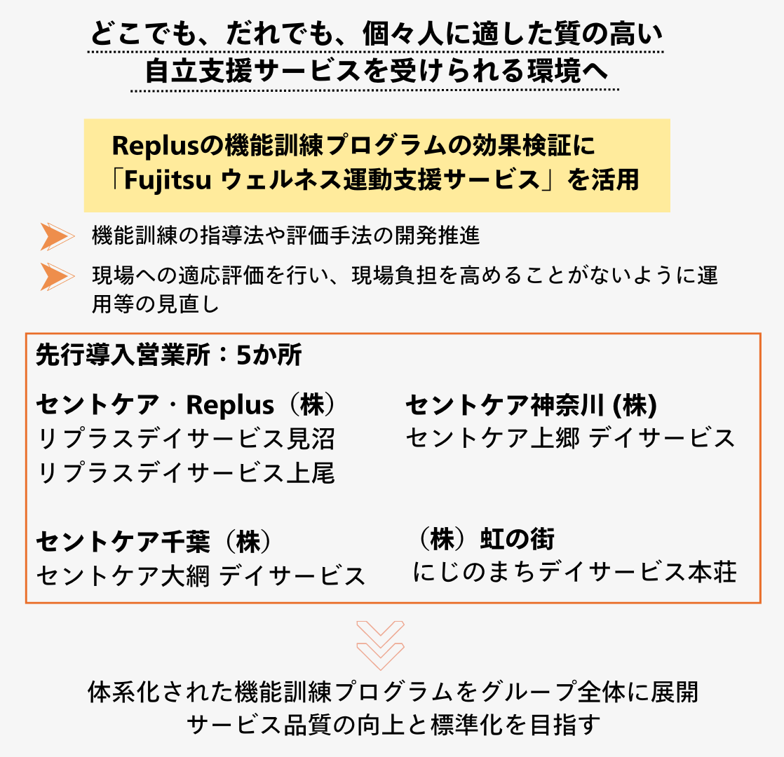 そこで、当社グループが創業以来40年、一貫して注力してきた在宅ケア領域の知見を活かし、現場に根差した科学的介護の実現に向けて、富士通Japanの協力のもと、同社が提供する「Fujitsu ウェルネス運動支援サービス」(以下、「ウェルネス運動支援サービス」)を活用し自立支援サービスの質向上、機能訓練の体系化などを目指した取り組みを実施し、将来的に当社の全デイサービスへの導入を目指します。