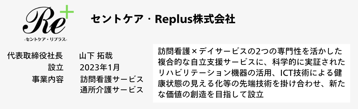 本取り組みの中核に、先端技術活用による更なる自立支援サービスの発展を目指して2023年に設立した新会社「セントケア・Replus株式会社(※)」(以下、セントケアReplus)を置き、機能訓練の指導法や評価手法の開発を推進します。
