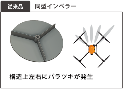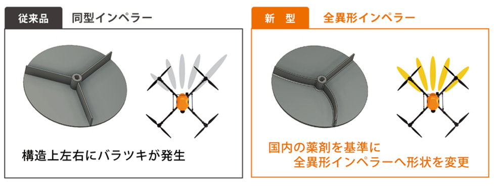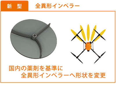 粒剤や肥料散布でも高い散布性能を実現するために開発をはじめ、薬剤の流れや勢い、タンクの形状、インペラー(羽根車)のフィン形状など様々な視点から研究し、より均等に散布する装置が完成しました。認定機と同じ性能で、タンクの蓋を開ければ簡単に薬剤の補充を行うことができ、バッテリーもタンクの上に乗せるだけで従来のものと手軽さは変わりません。吐出量は送信機で操作できます。装置本体の大幅な改善を行うことで詰まりなどのトラブルが減少しています。