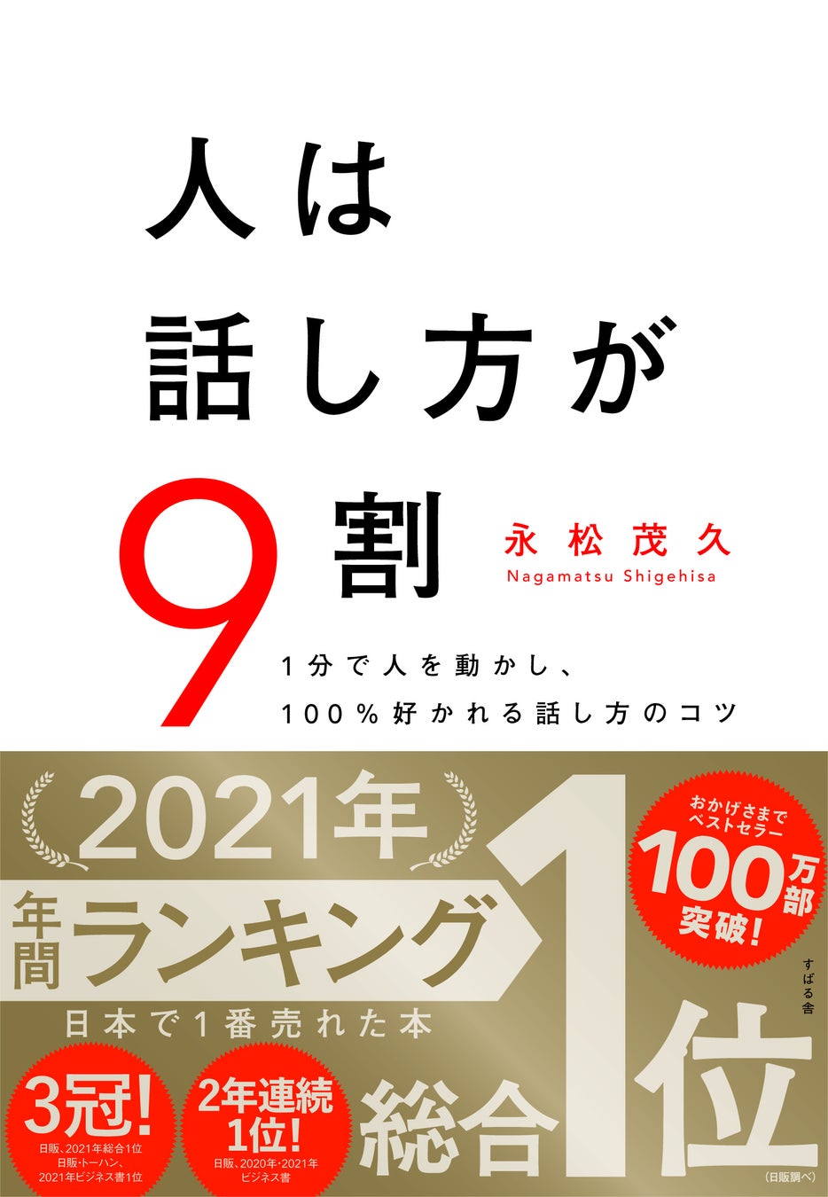 書店売り単行本を出版している株式会社すばる舎(本社:東京都豊島区、代表取締役社長:徳留慶太郎)から発行している『人は話し方が9割』(永松茂久著、2019年9月1日発売)が、2022年6月1日に発表された日販(日本出版販売)の2022年上半期ベストセラーランキング(21年11月22日~22年5月21日集計)で、2021年年間に続き2期連続で総合1位、ビジネス書部門でも2020年年間、2021年上半期、2021年年間に続き、4期連続で1位になりました。また、同日トーハンから発表された上半期ベストセラーランキングでも、2021年上半期、2021年年間に続き、3期連続で、ビジネス書部門1位になりました。