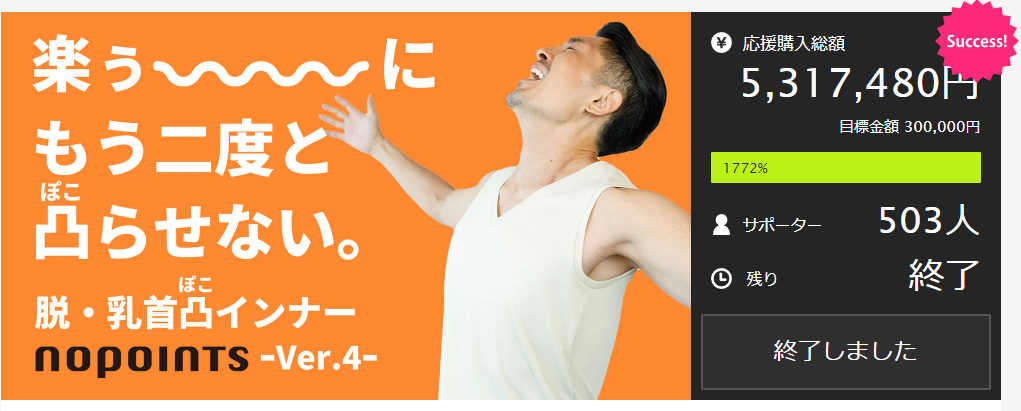 ノーポインツVer.4は、寄付サイト「MAKUAKE」のメンズアンダーウェアカテゴリーにて、最高額の5,317,480円、サポーター数503人から993枚のご支援を頂きました。(2022年9月時点)