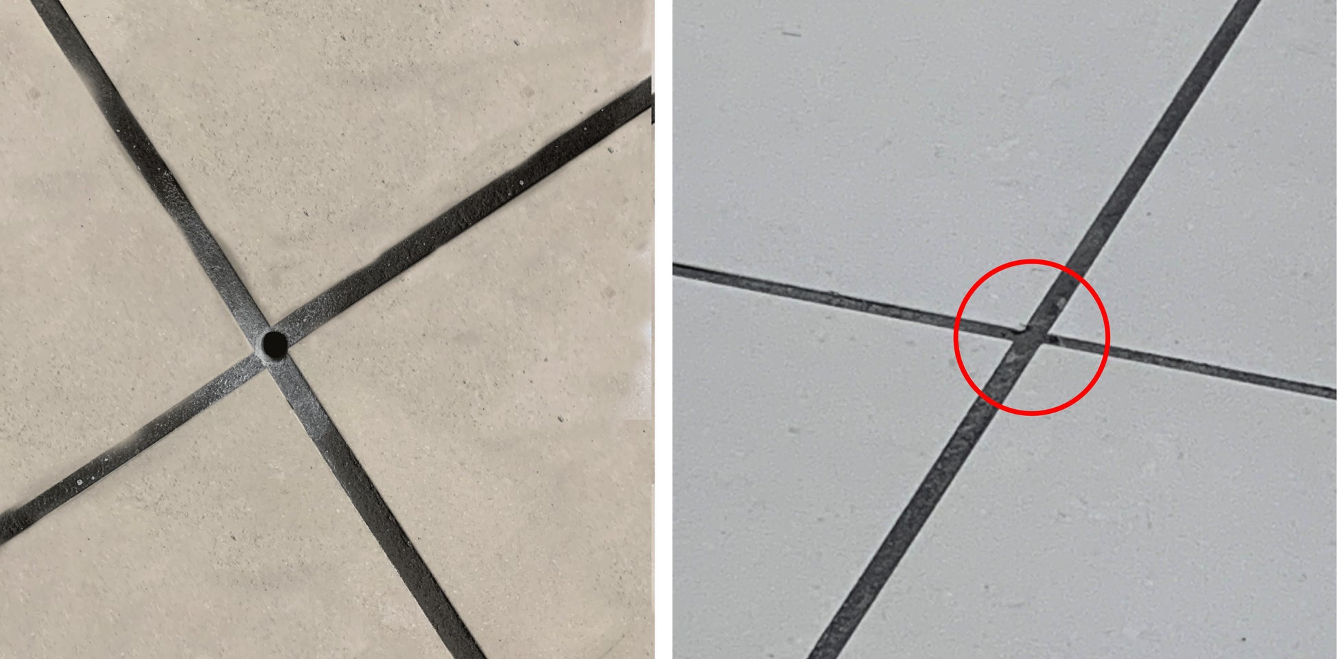 (左)タイルの目地に開けた6mmの注入孔 (右)施工後埋め戻した孔はほとんど目立たない