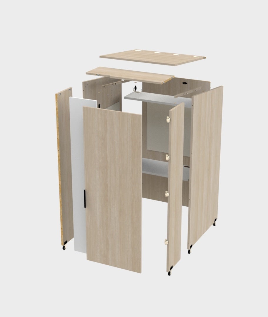 「吸音ウェブース」は木のぬくもりを感じるデザイン性・最適な吸音性・ニーズに寄り添う柔軟性を兼ね備えた吸音ワークブースです。換気の関係上隙間が空いている部分がございますが、開閉可能な天井やドアのオプションを追加していただくことでより個室に近い状況を作り出すことが可能です。