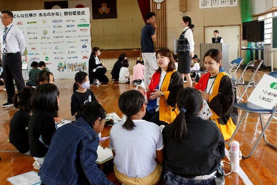 贈呈式の後には、児童を10のグループに分け、参加企業様によるミニ講話も実施しました。どういう仕事をしている会社なのか、どんな思いで働いているのか、子どもたちは興味津々でした。