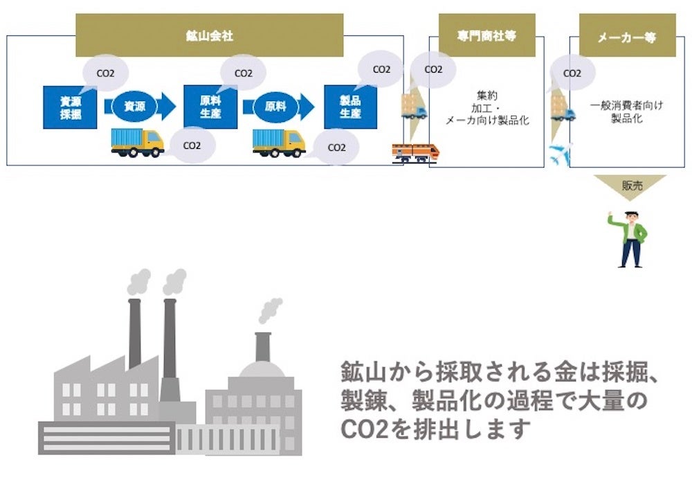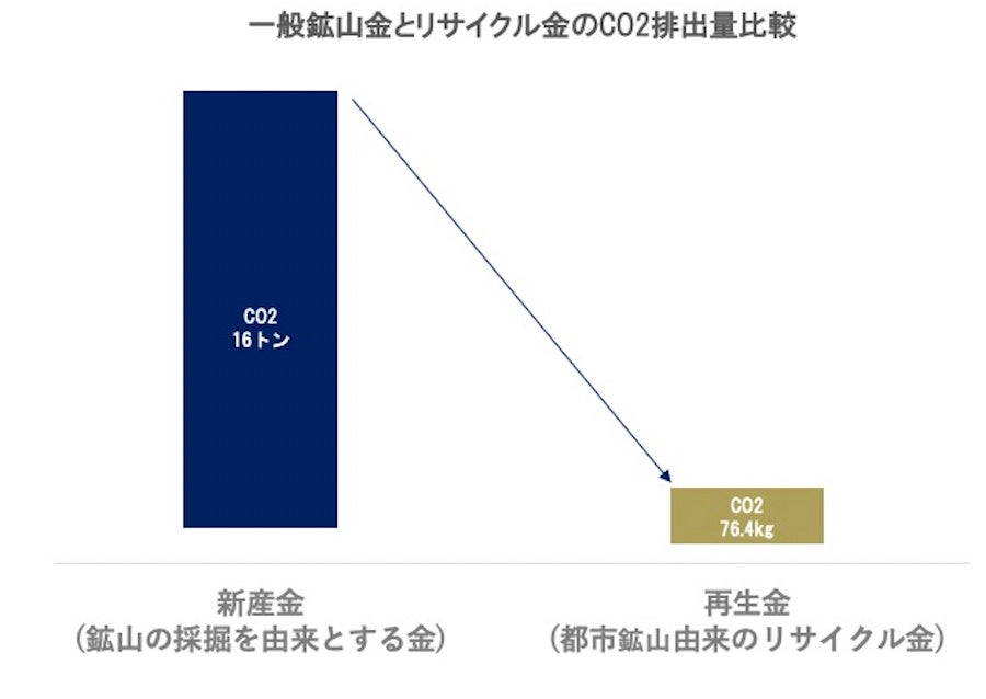 LCAにおいて、新産金(鉱山採掘由来の金)1㎏の生産につき約16.0t-CO2相当の環境負荷があるとする先行調査を参考に、比較評価を行いました。 その結果、当社の扱う再生金は新産金に対して環境負荷が約200分の1である事が証明され、再生金を活用することで環境問題への取組に大きく貢献することが裏付けられました。