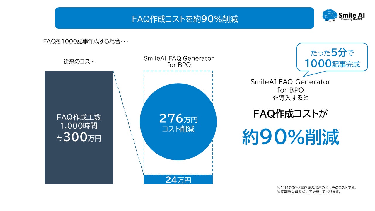 「SmileAI FAQ Generator for BPO」を導入することで、従来のFAQ作成にかかっていたコストと時間を約90%削減できます。