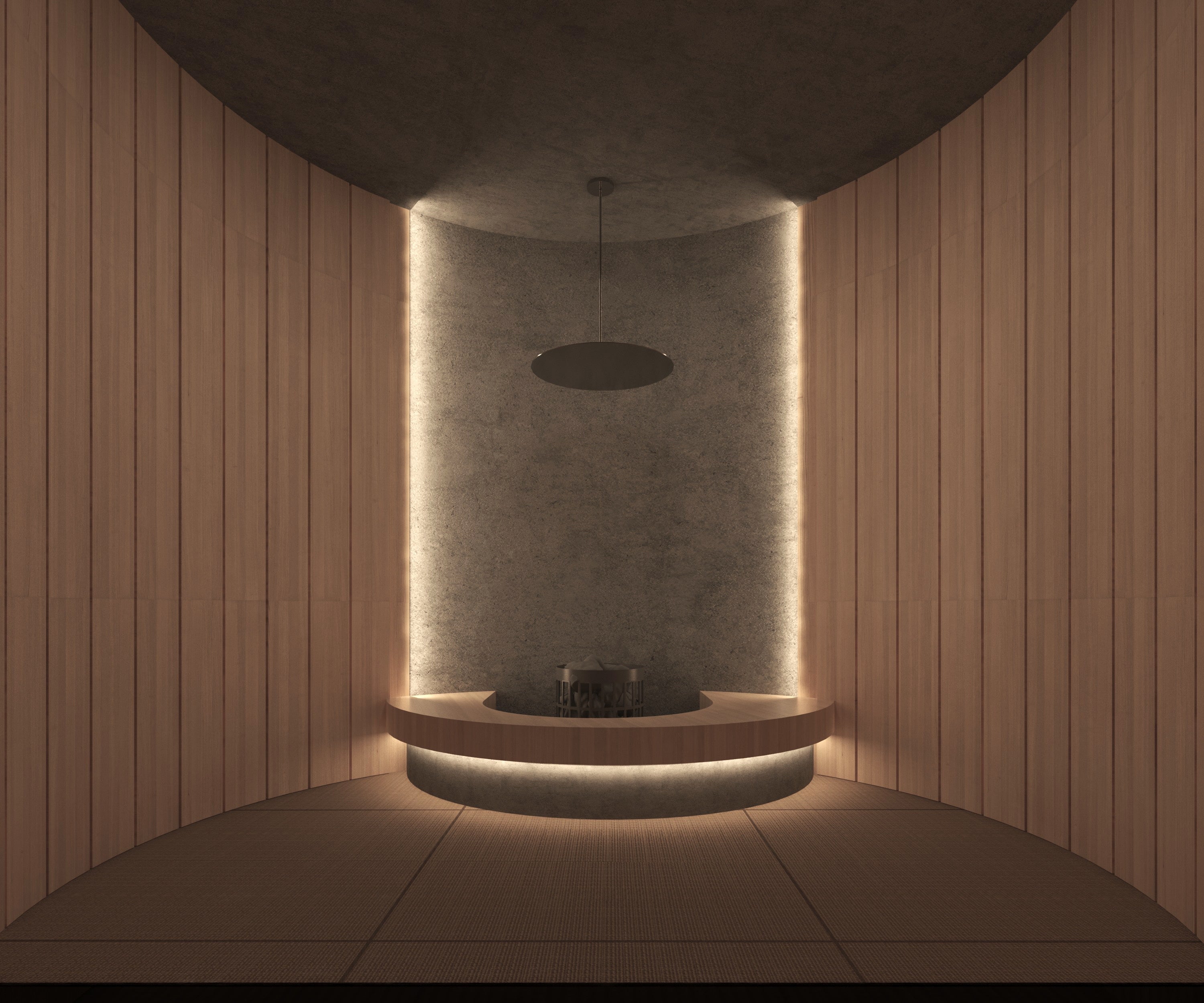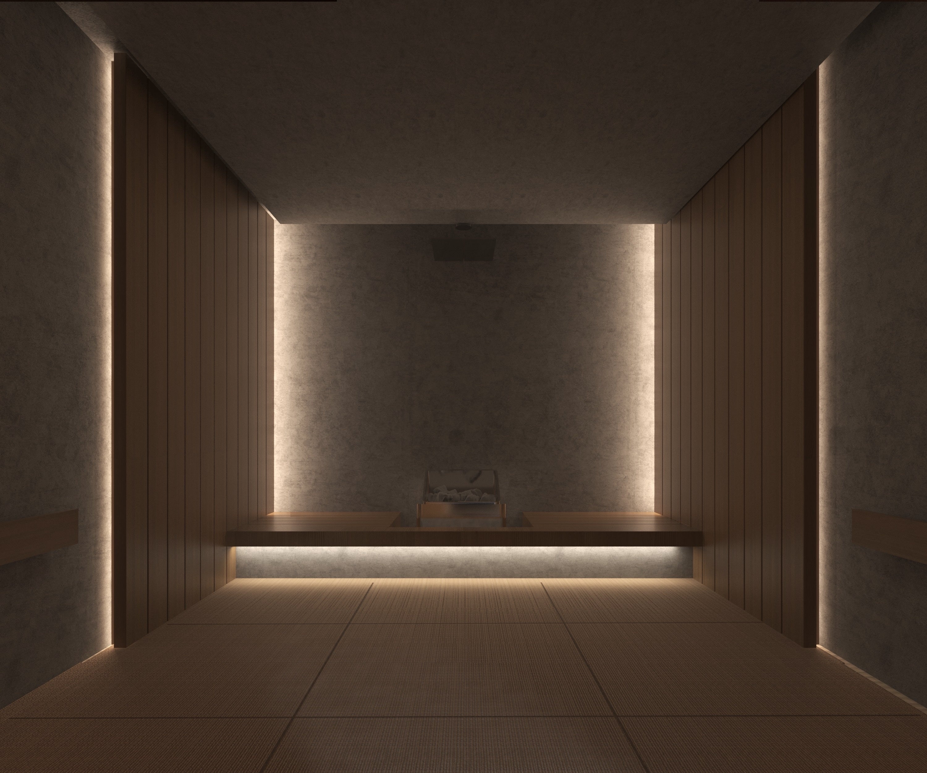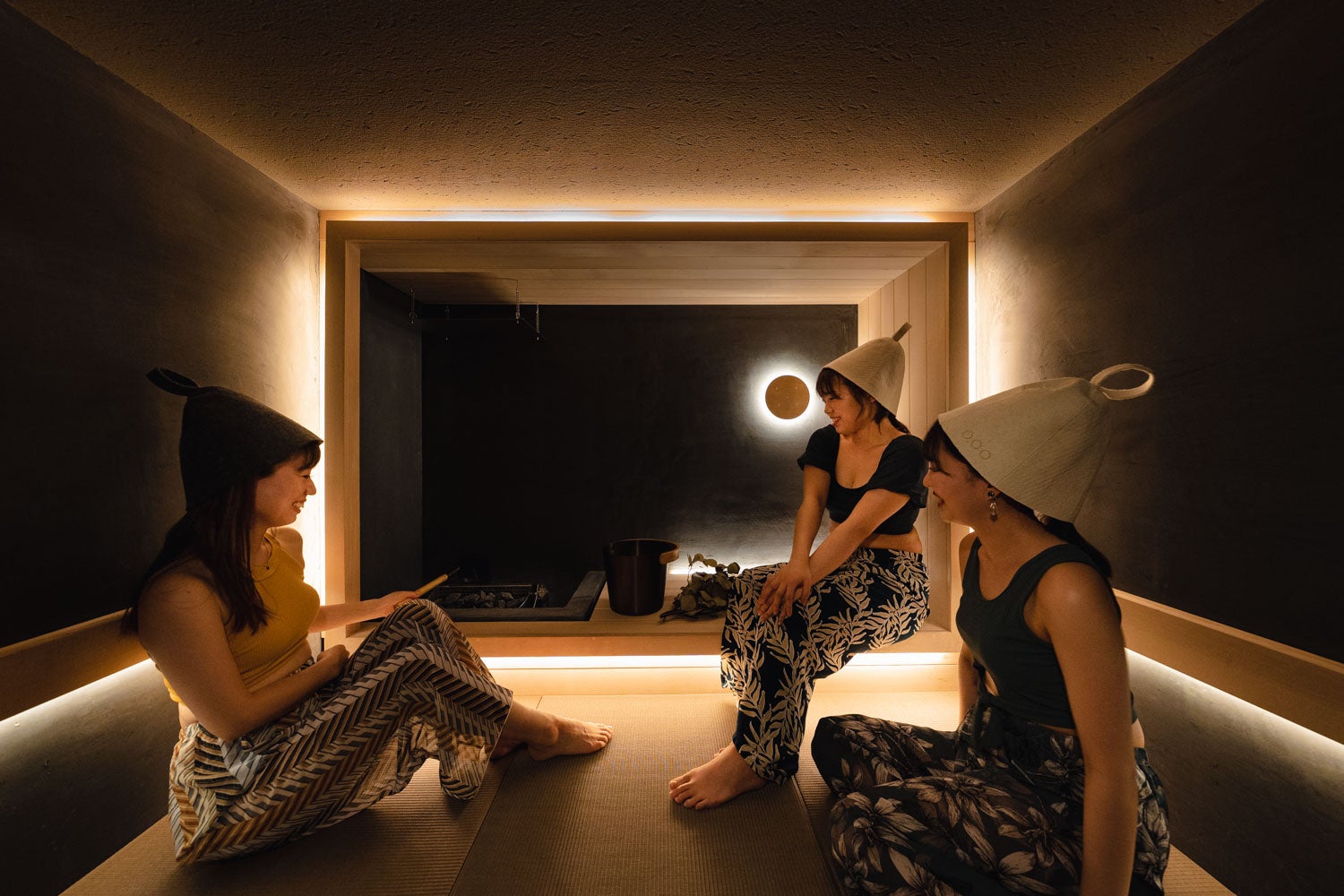 わたしたちは、慌ただしい日々をスローにゆるめ、自分と向き合う時間に寄りそうお茶、自分や目の前の人と向き合える茶室に込められた、東洋文化を大切にした企画開発を行ってきました。コミュニケーションサウナ「OOO」は、フィンランド式サウナと茶室をかけ合わせた特別な空間。サウナ室を茶室、水風呂を坪庭、休憩スペース(内・外気浴場)を縁側に見立てています。床に座って仲間とじっくり語り合い、ととのい、自分自身や仲間と向き合える場です。