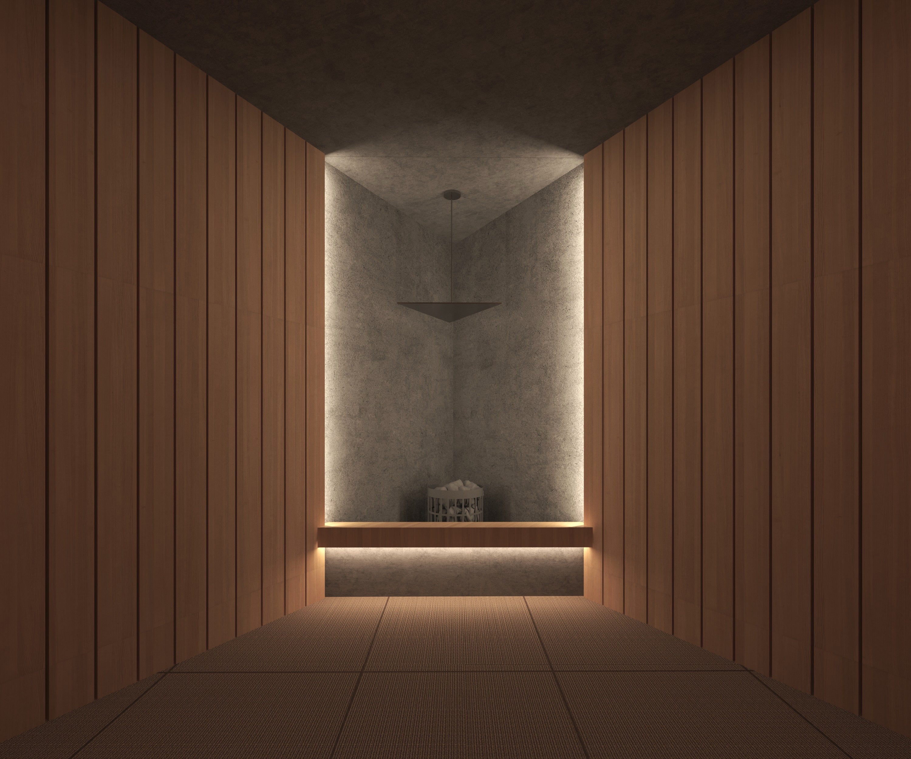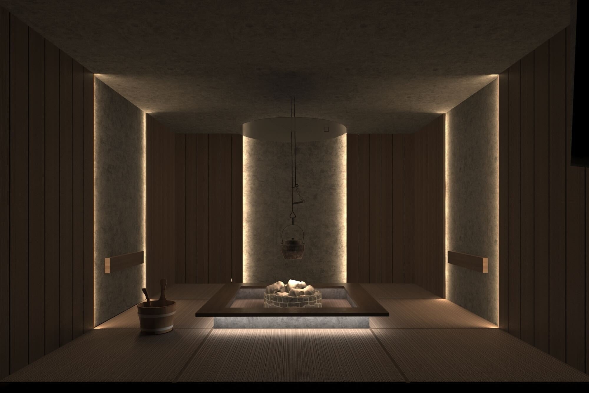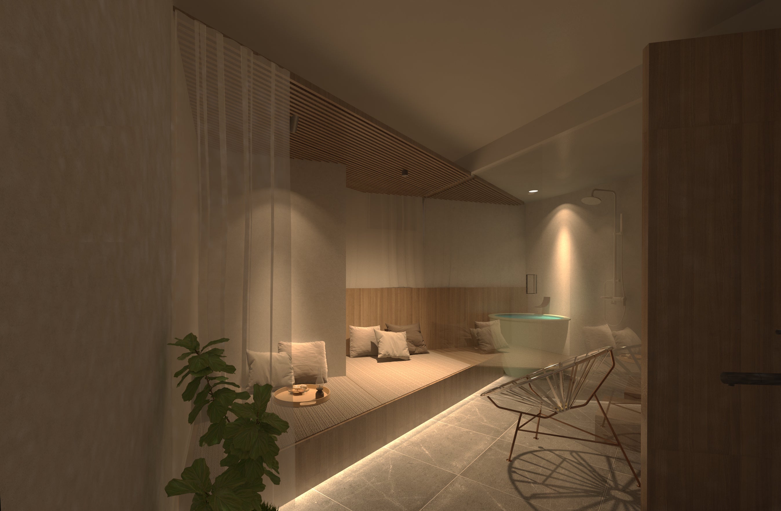 わたしたちは、慌ただしい日々をスローにゆるめ、自分と向き合う時間に寄りそうお茶、自分や目の前の人と向き合える茶室に込められた、東洋文化を大切にした企画開発を行ってきました。コミュニケーションサウナ「OOO」は、フィンランド式サウナと茶室をかけ合わせた特別な空間。サウナ室を茶室、水風呂を坪庭、休憩スペース(内・外気浴場)を縁側に見立てています。床に座って仲間とじっくり語り合い、ととのい、自分自身や仲間と向き合える場です。