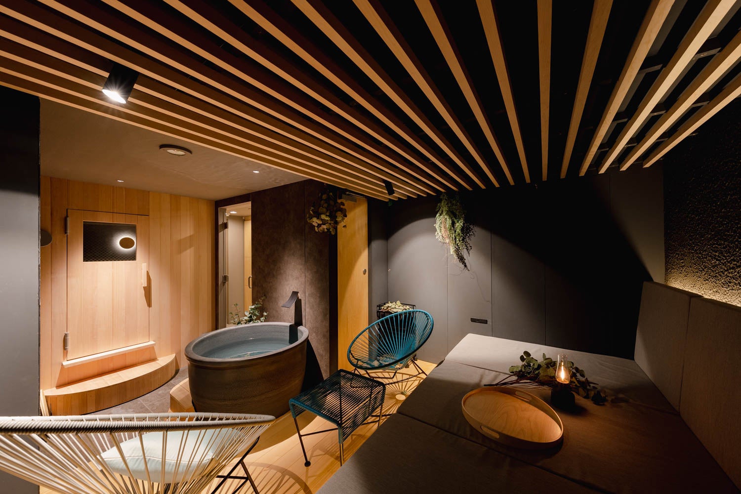 少人数から貸切利用が出来る、完全予約制のサウナです。大切な誰かと過ごす「コミュニケーションサウナ」をコンセプトに、サウナ室、水風呂、休憩スペースまでをコンパクトな導線設計にこだわり、仲間と語り合うひとときに最適な環境をご用意。特に、サウナ室は全室畳張りで自然体に導く形状、広々とした休憩スペースはフラットな小上がりなど、話しやすさにこだわっています。プライベートでのご利用もさることながら、ビジネスシーンでも異なる環境でのブレストでいつも出てこないアイデアが浮かび、チームの関係性も強まるかもしれません。