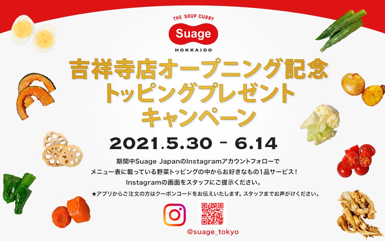オープンを記念して、Instagramをフォローすると野菜トッピングが1点無料キャンペーンも全店舗で実施予定!この機会にぜひSuageのスープカレーをお召し上がりください。