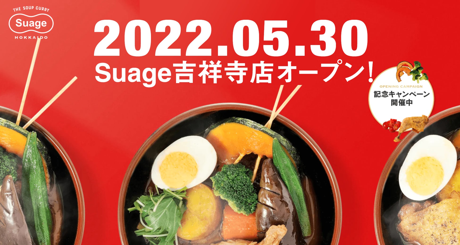 北海道スープカレーを提供する株式会社Suage Japan(代表取締役:服部 峻介 所在地:東京都渋谷区)は、2022年5月30日(月)に吉祥寺に都内4店舗目となる吉祥寺店をオープン致します。