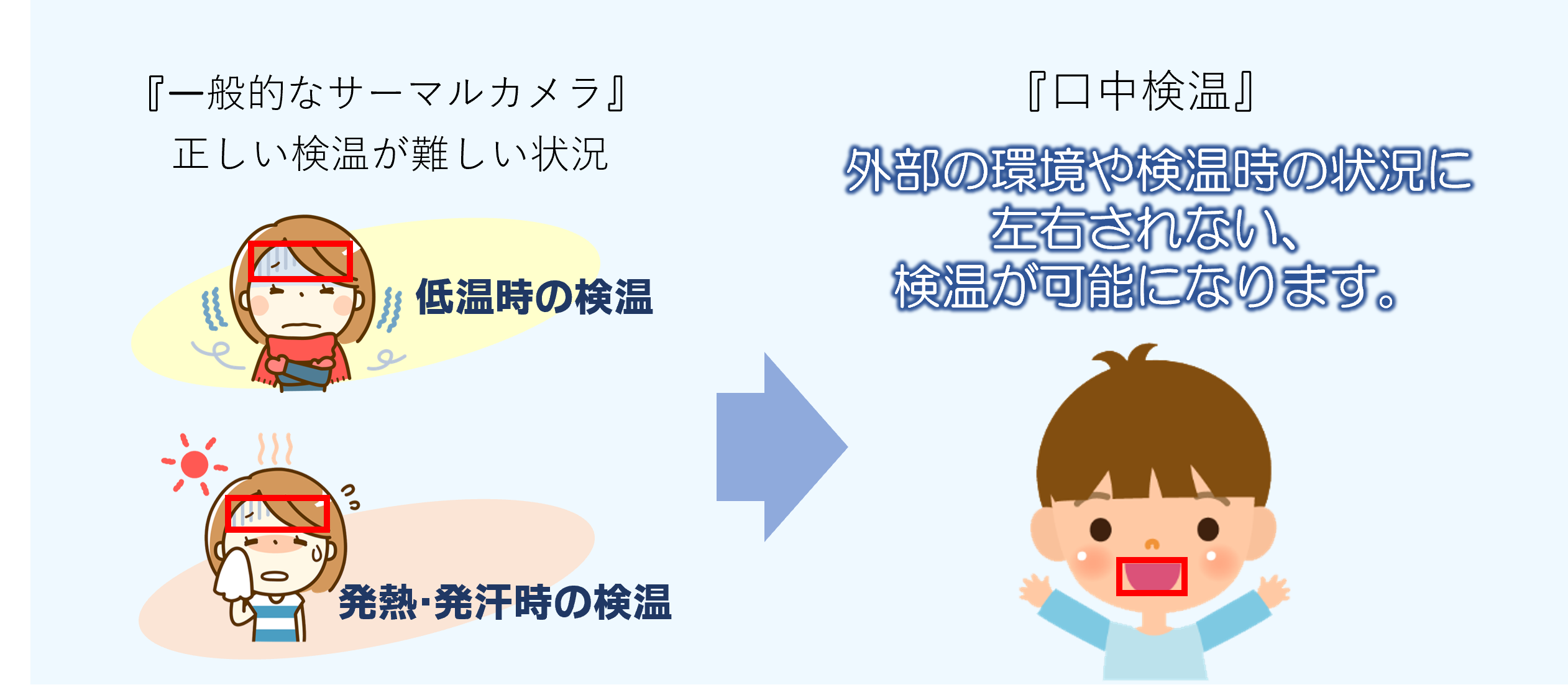 EG-Keeper®のクチナカ™(口中)検温では、『口腔内の最も高い表面温度を測定』する口中検温方式を採用することで、従来のサーマルカメラより精度の高い検温結果が得られます。