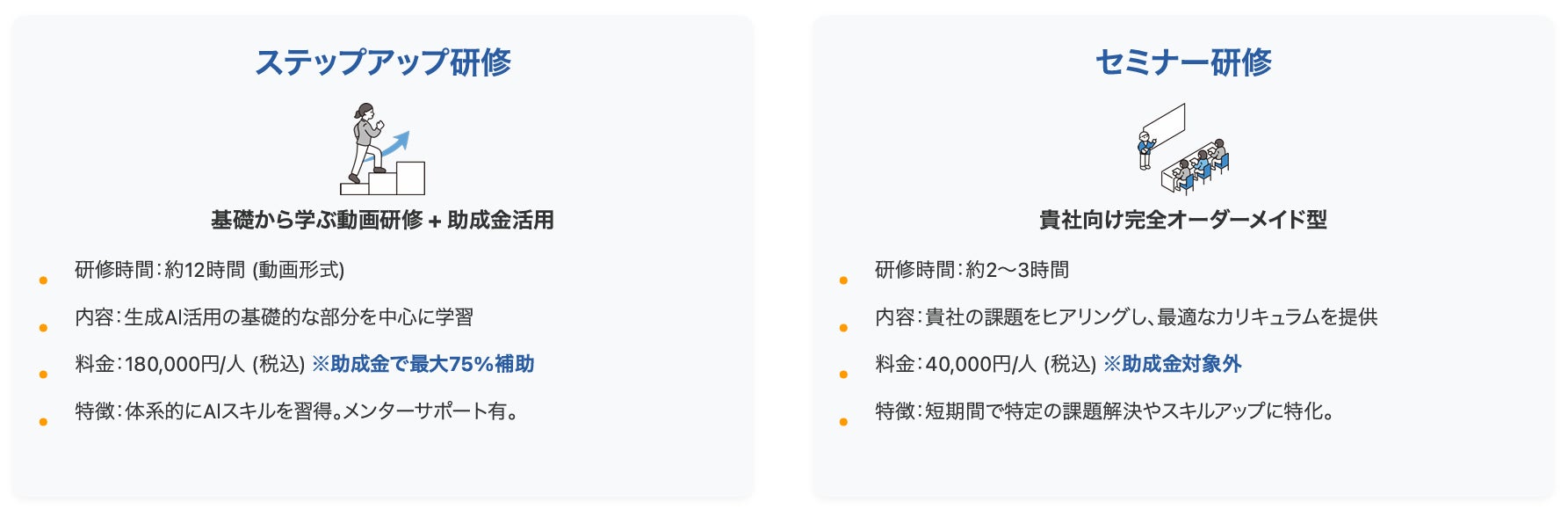 株式会社ファンリピート(本社:東京都千代田区、以下 ファンリピート)は、企業のデジタルトランスフォーメーション(DX)と働き方改革を支援するため、厚生労働省による人材開発助成金を活用することで研修費用を最大75%削減可能な「生成AI研修」を本日より提供開始いたします。本プログラムは、生成AIの導入や活用における「スキル不足」「コスト負担」「ノウハウ不足」といった企業の課題を解決し、実務に直結するAIスキルの習得と生産性向上を同時に実現します。