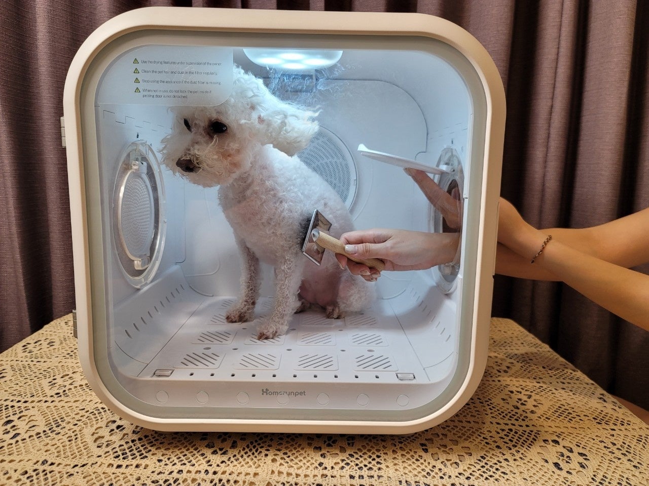 乾燥中もペットを触ってなでたりできる窓付きで、ブロー中の風はマイナスイオンを含んでいるためふわふわツヤツヤの仕上がりに、また女性でも持ち運び可能なコンパクトさで、飼い主にもペットにも優しいドライヤーハウスがついに完成しました。
