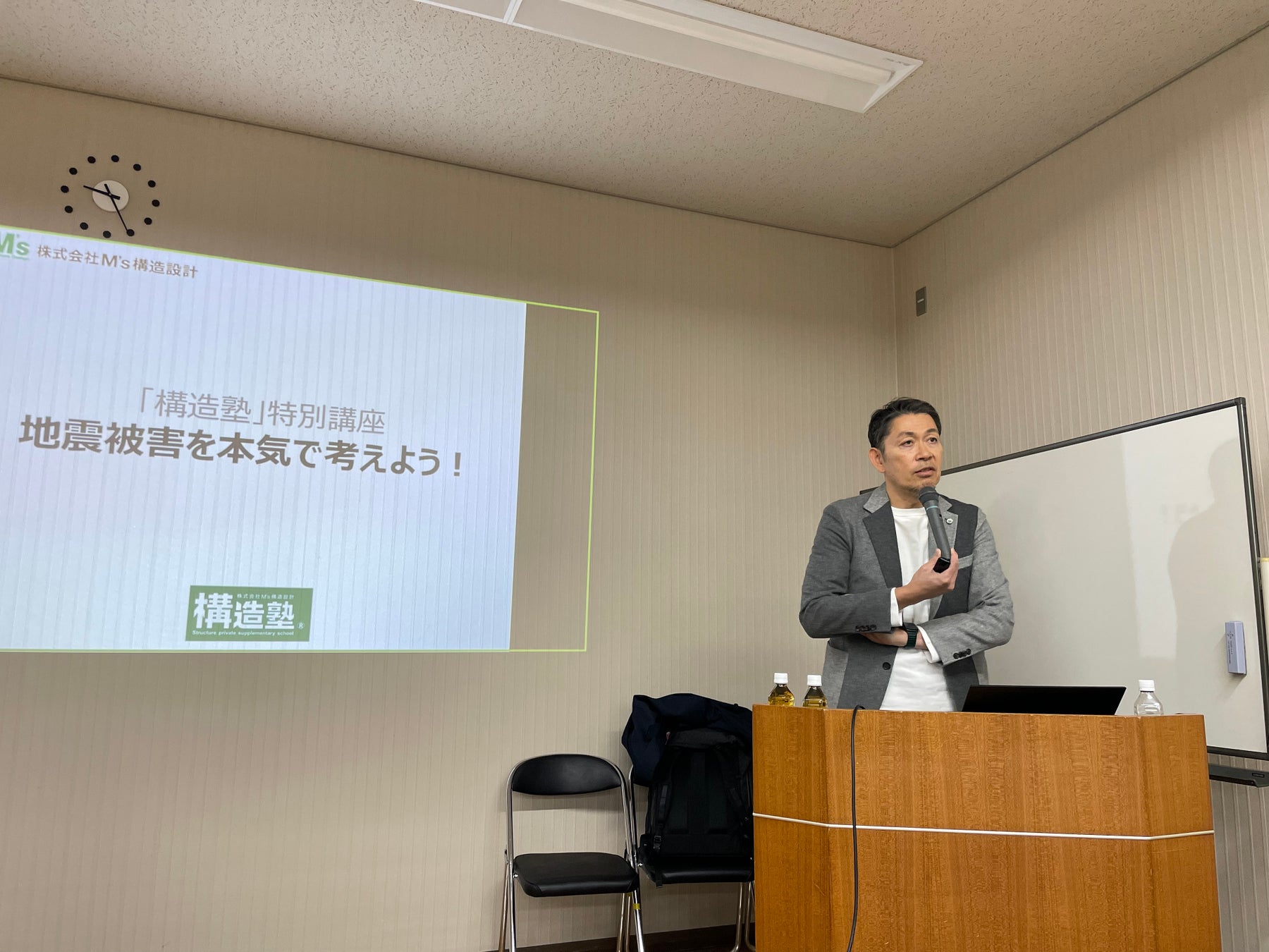 キックオフとなった初回研修は、「地震被害から学ぶ住宅の耐震性能」と「構造計画ルール」の二部編成。第一部では、主に耐震強度の考え方や耐震等級3を標準化する重要性を。第二部では、設計時にどのような工夫をすれば安全性が保たれるかなどを学びました。