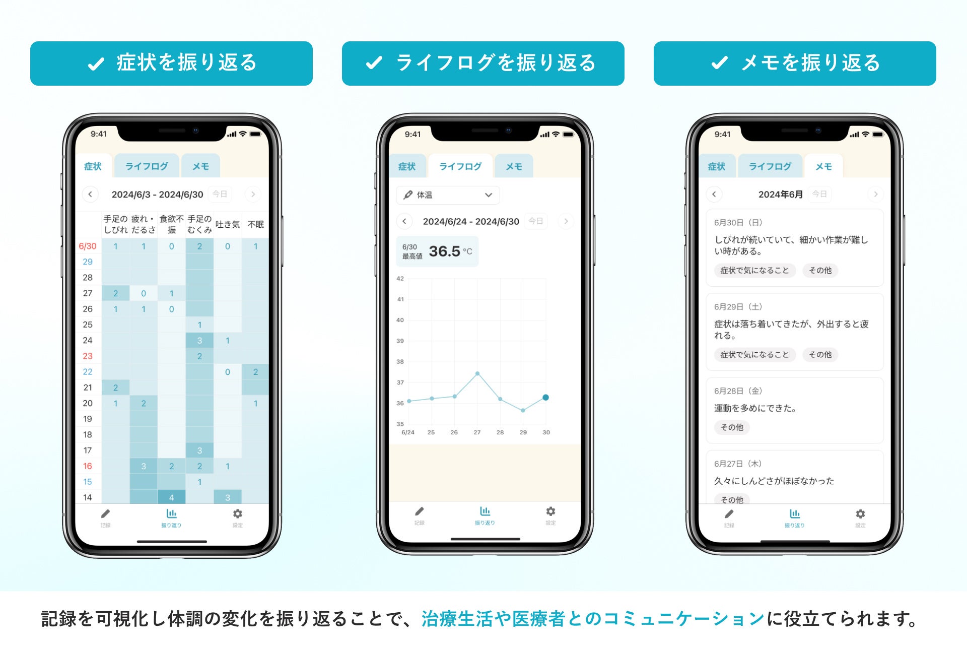 記録した内容をもとに分かりやすいグラフが自動で作成され、体調の変化を振り返ることができ、医療者への相談の際にも活用できます。
