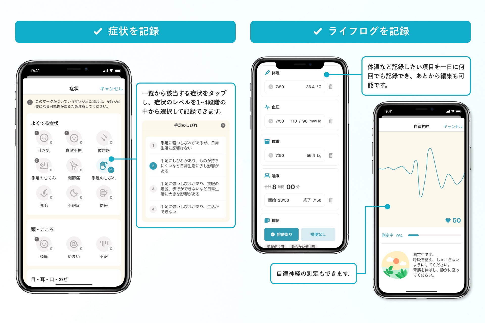 「ハカルテ」は、患者が自分のスマホで日々の体調やライフログ*1を記録し、診察前に体調記録やメモを確認することで、前回の治療以降の体調変化や質問事項を伝えやすくし、主体的な治療をサポートします。
